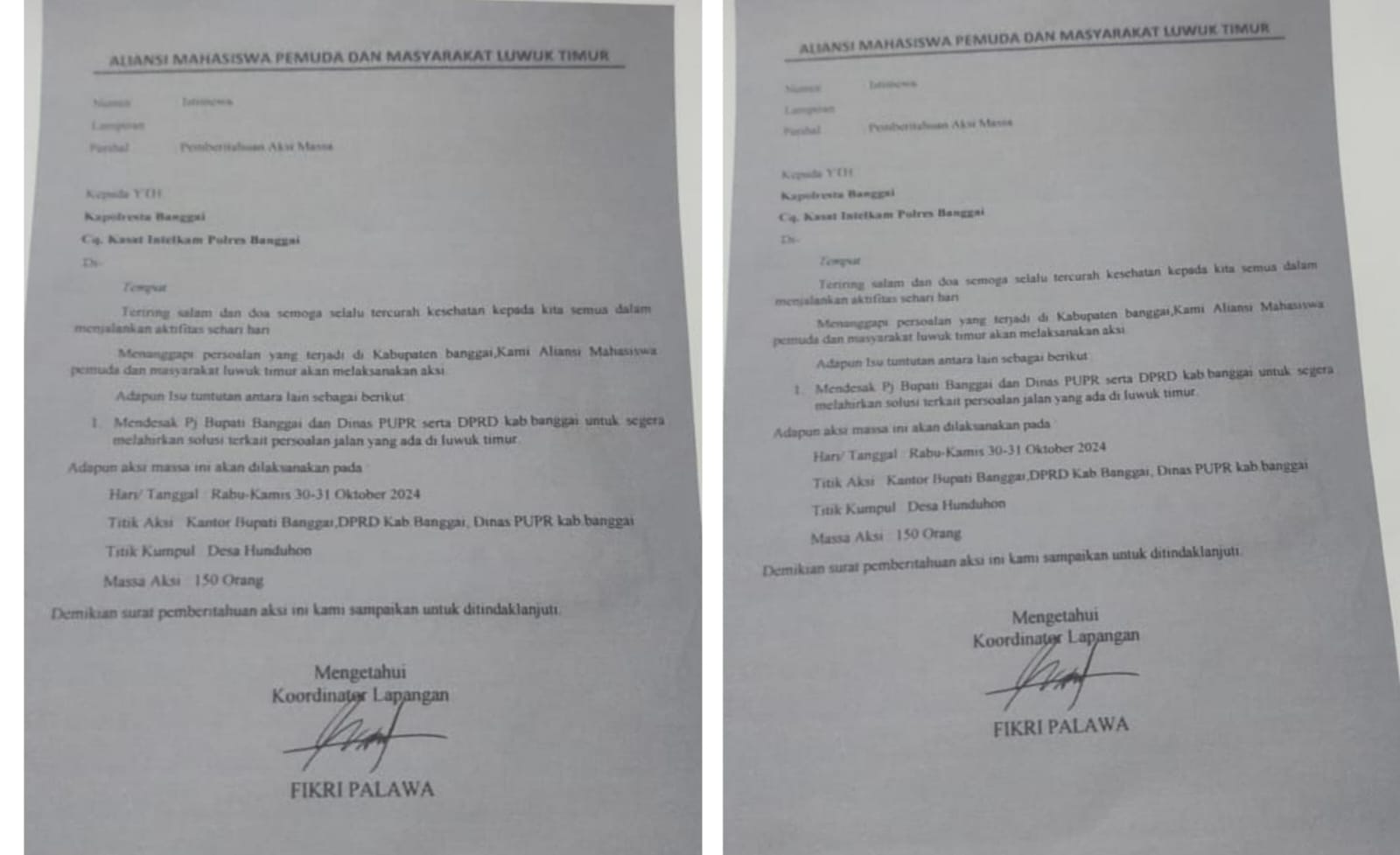 Rencana aksi ini berdasarkan informasi yang diterima media ini, melalui surat selebaran yang ditujukan ke Kapolres Banggai, dan ditandatangani Fikri Palawa.