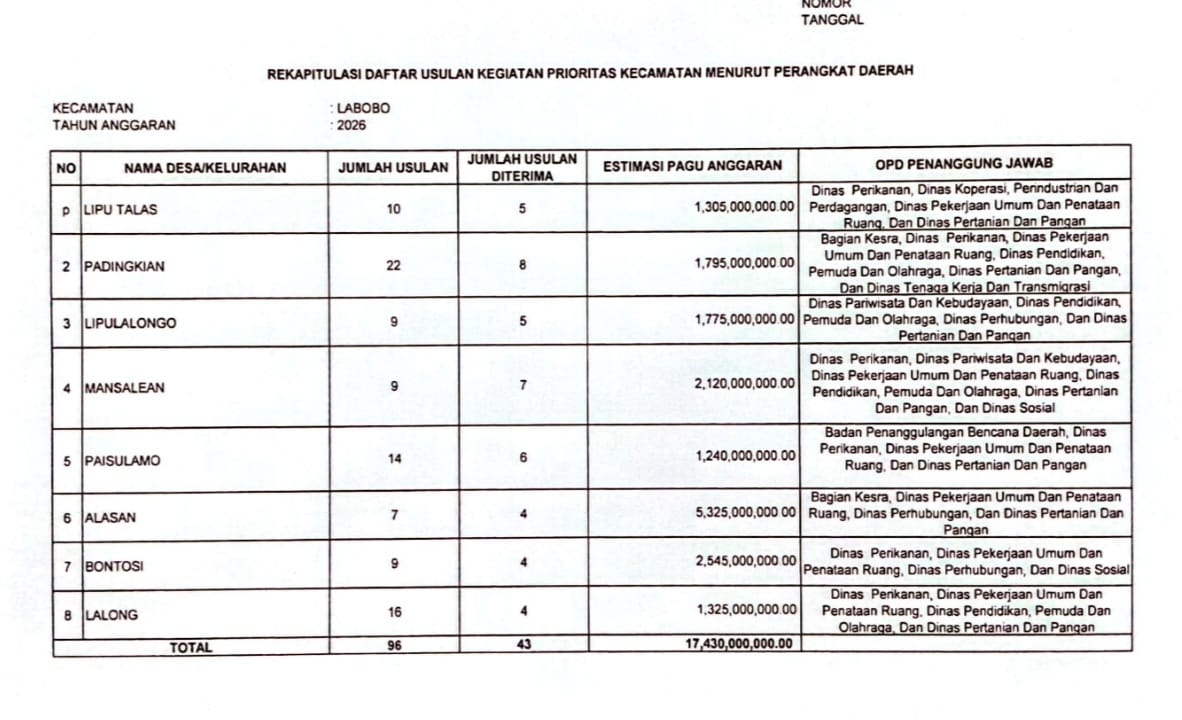 Banggaikece.id- Musyawarah Perencanaan Pembangunan (Musrenbang) Rencana Kerja Pemerintah Daerah (RKPD) Kabupaten Banggai Laut (Balut) tahun 2026 untuk Kecamatan Labobo menghasilkan 45 usulan yang diterima dari 95 usulan yang diajukan.