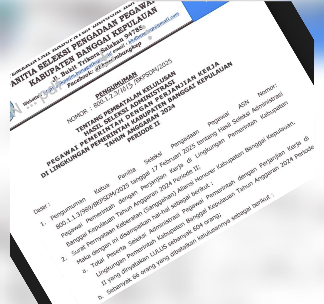 Pembatalan kelulusan puluhan calon PPPK ini berdasarkan pengumuman bernomor 800.1.2.3/1013/BKPSDM/2025 yang ditandatangani Ketua Panitia Seleksi Pengadaan Pegawai ASN Kabupaten Bangkep, Dr. Artoyono Orab, S.Pd..S.Sos..MM, tertanggal 24 Februari 2025.