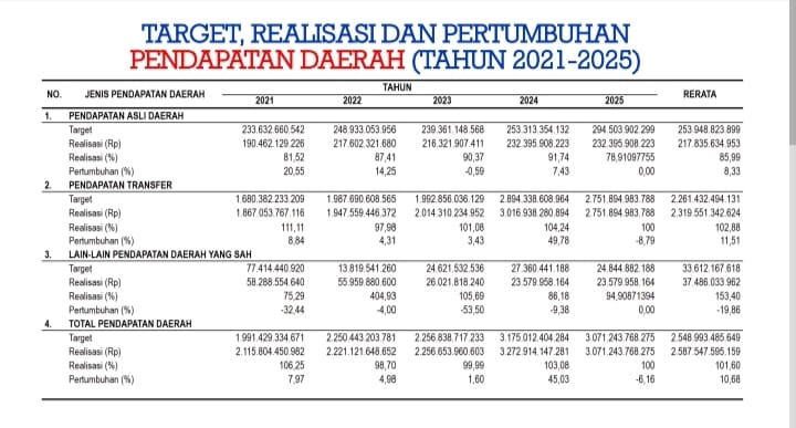 Dari data Badan Pendapatan Daerah (Bapenda) Kabupaten Banggai yang dipaparkan pada kegiatan Forum Perangkat Daerah yang membahas proyeksi tahun 2026, Senin (17/3/2025), terlihat bahwa selain porsi PAD yang kecil dalam postur APBD, juga realisasi PAD yang selalu gagal mencapai target.