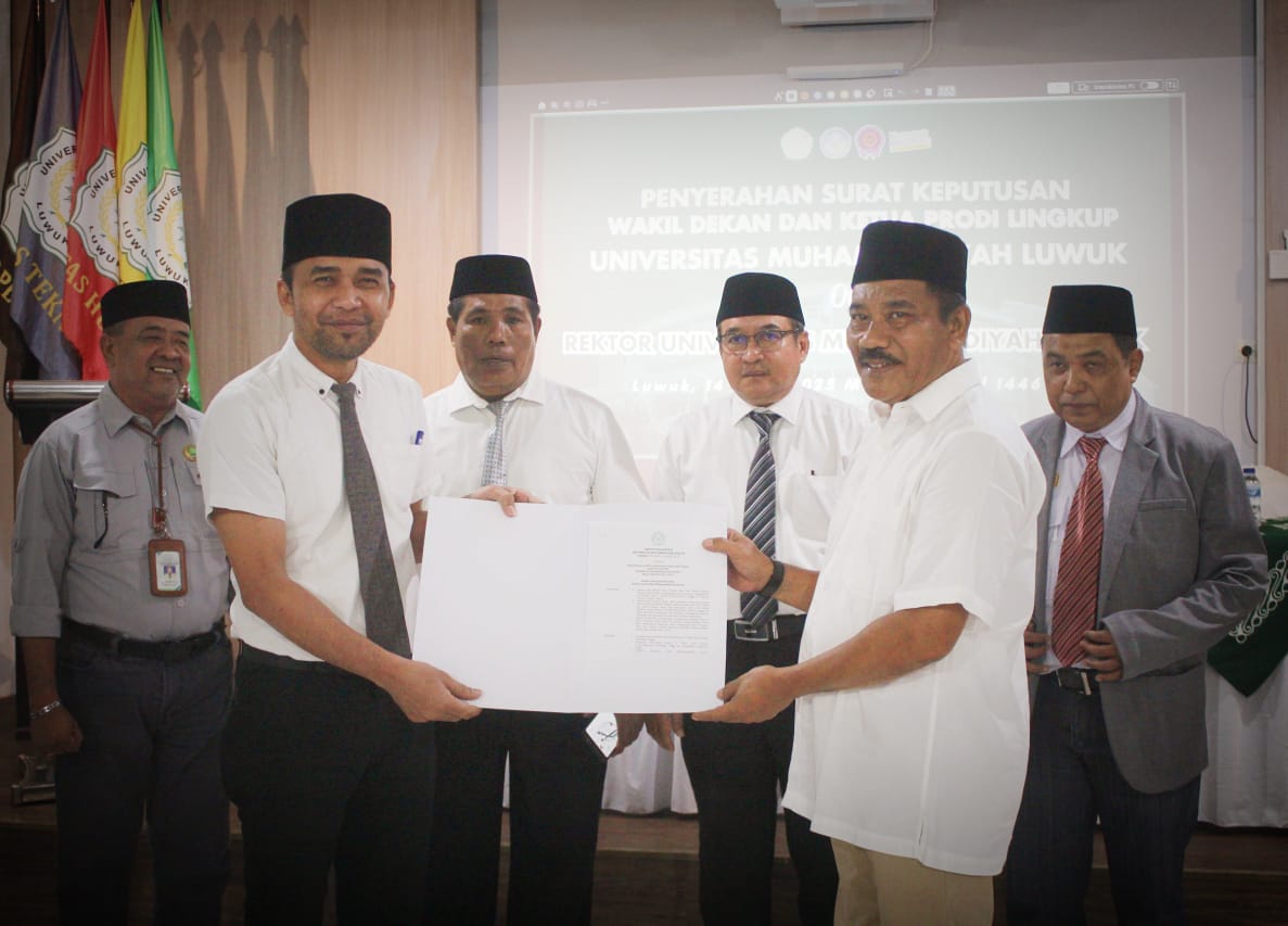 Banggaikece.id – Rektor Universitas Muhammadiyah (Unismuh) Luwuk Banggai, Dr. Sutrisno K. Djawa, SE., MM., secara resmi menyerahkan Surat Keputusan (SK) kepada para Wakil Dekan (WD) dan Ketua Program Studi (Kaprodi) di lingkungan kampus hijau, Senin, 14 April 2025.