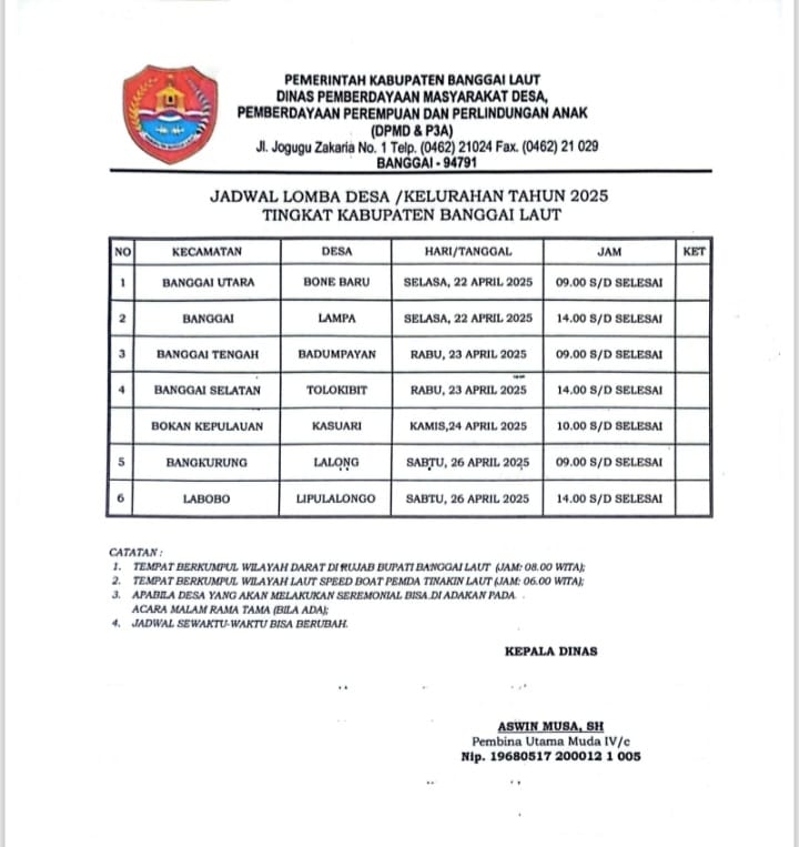 Banggaikece.id – Jadwal penilaian Lomba Desa (Lomdes) di seluruh kecamatan se-Kabupaten Banggai Laut (Balut) akan dilaksanakan pada minggu keempat bulan April, tepatnya mulai Selasa (22/4/2025). Penilaian dimulai dari Desa Bone Baru, Kecamatan Banggai Utara.