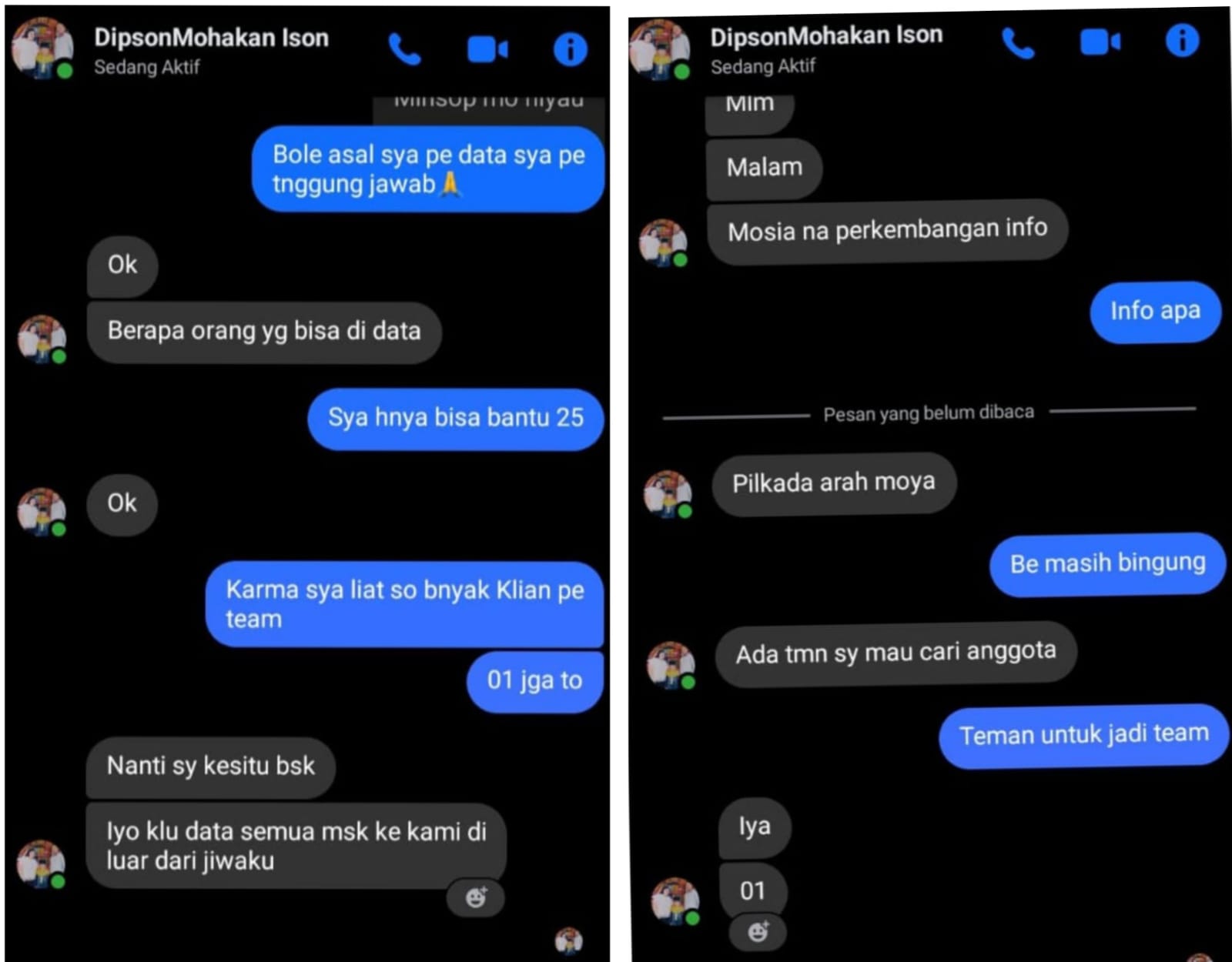 “Dalam chat tersebut, Pak Dipson bertanya soal arah pilihan pilkada. Warga menjawab masih bingung, lalu Pak Dipson mengatakan ada temannya yang sedang mencari anggota tim. Saat warga bertanya untuk tim siapa, Pak Dipson menjawab ‘iya 01’,” beber sumber tersebut kepada media ini, Rabu, 16 April 2025.
