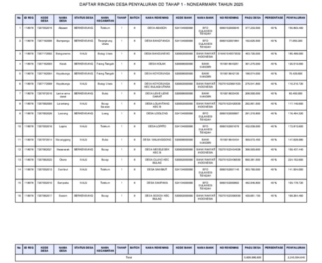 Banggaikece.id – Sebanyak 16 desa di Kabupaten Banggai Kepulauan (Bangkep) telah menerima penyaluran Dana Desa (DD) tahap pertama untuk periode Januari hingga Maret 2025.