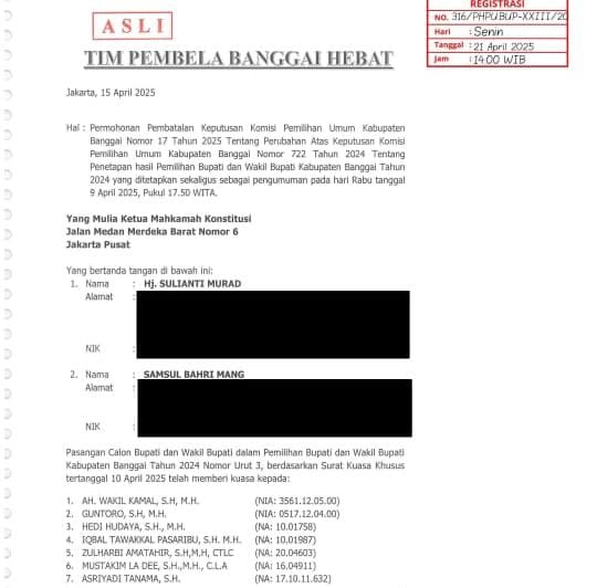 Banggaikece.id- Gugatan yang dilakukan oleh Pasangan Calon Bupati dan Wakil Bupati Banggai Sulianti Murad-Samsul Bahri Mang terhadap hasil pemungutan suara ulang (PSU) Pilkada Banggai di Kecamatan Toili dan Simpang Raya, adalah upaya penegakkan demokrasi.