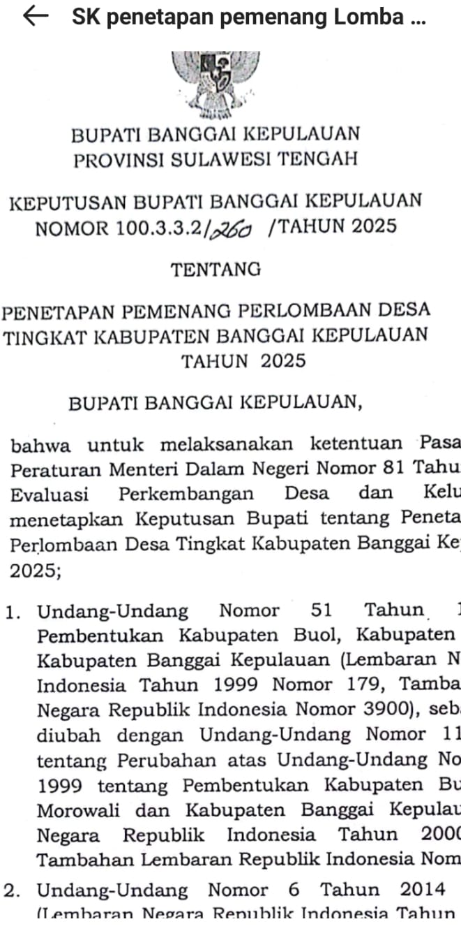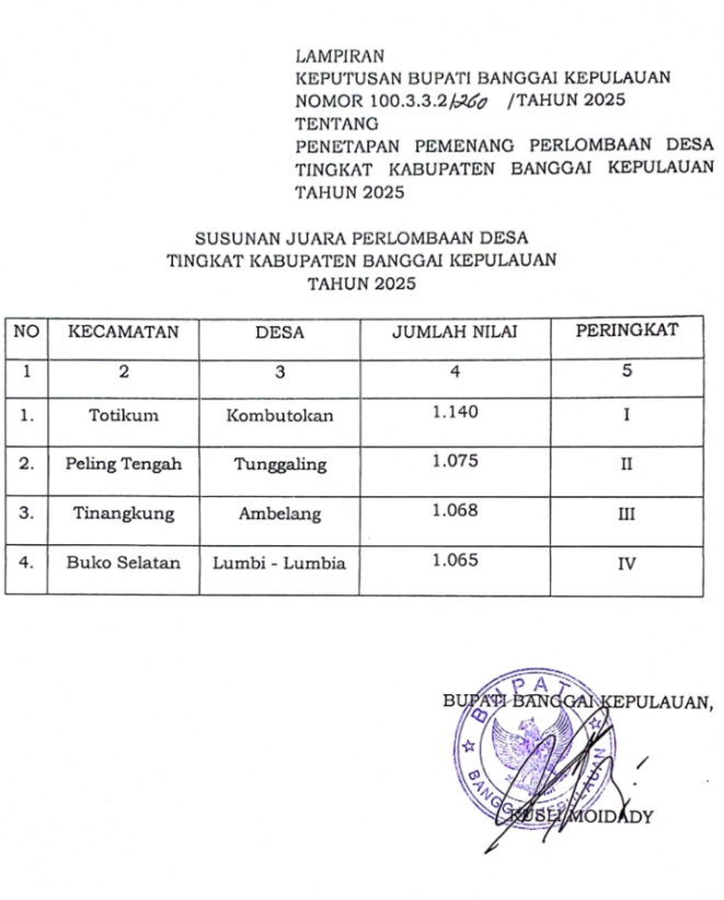 Banggaikece.id – Pemerintah Kabupaten Banggai Kepulauan melalui Dinas Pemberdayaan Masyarakat dan Desa (PMD) resmi mengumumkan hasil Lomba Desa dan Kelurahan Tingkat Kabupaten Tahun 2025.