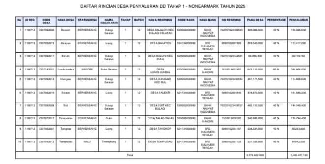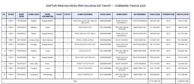 Banggaikece.id – Sebanyak 10 desa di Kabupaten Banggai Kepulauan (Bangkep) telah menerima penyaluran Dana Desa (DD) tahap pertama untuk periode Januari hingga Maret 2025.