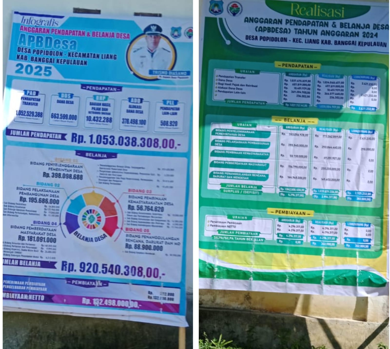 BanggaiKece.id – Pemerintah Desa Popidolom, Kecamatan Liang, Kabupaten Banggai Kepulauan (Bangkep), menunjukkan komitmennya terhadap keterbukaan informasi publik dengan memasang baliho transparansi anggaran di depan Kantor Desa Popidolom.