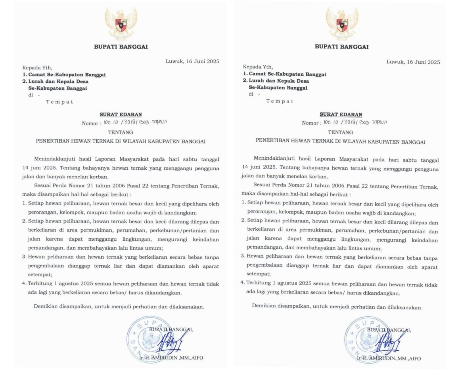 Banggaikece.id– Bupati Banggai, Ir. H. Amirudin, MM., AIFO resmi mengeluarkan Surat Edaran Nomor: 100.10/3018/BAG.TAPEM pada 16 Juni 2025 tentang Penertiban Hewan Ternak di Wilayah Kabupaten Banggai.