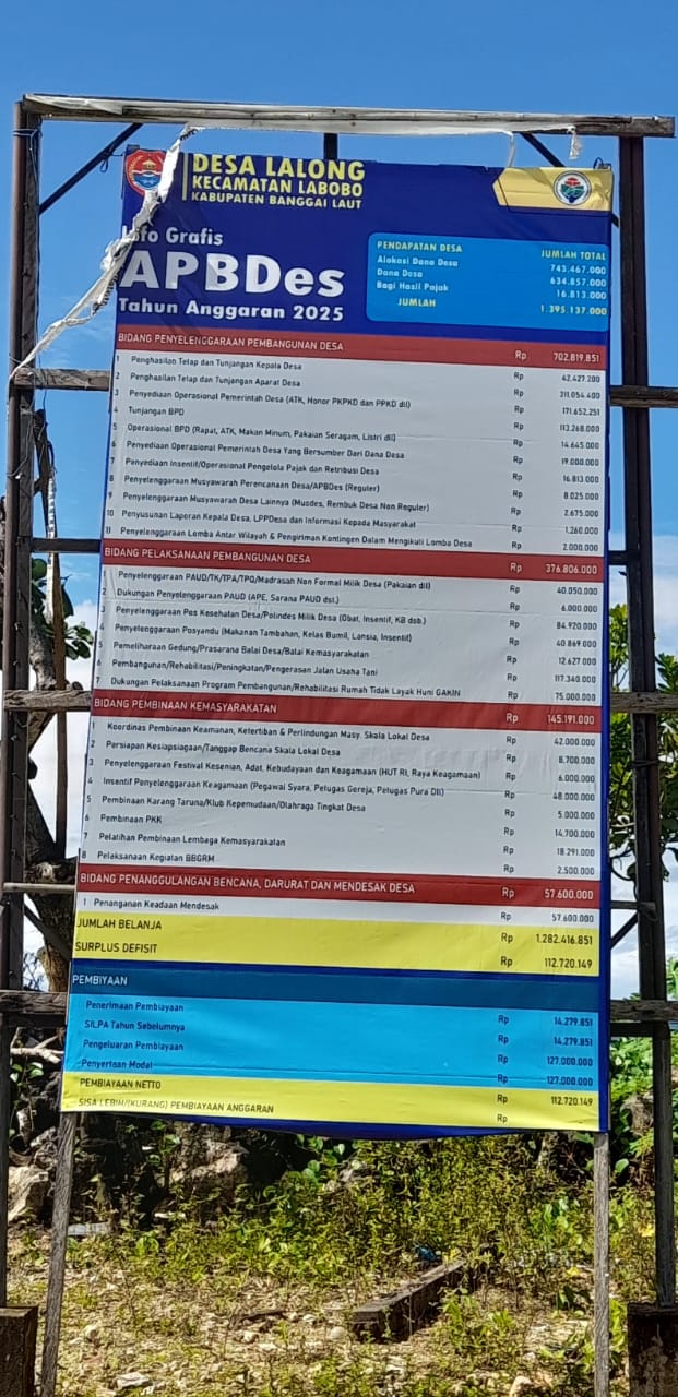 Banggaikece.id – Guna mewujudkan keterbukaan informasi publik dalam pengelolaan anggaran, Pemerintah Desa (Pemdes) Lalong, Kecamatan Labobo, Kabupaten Banggai Laut, memasang baliho transparansi Dana Desa Tahun Anggaran 2025 di sejumlah titik strategis.