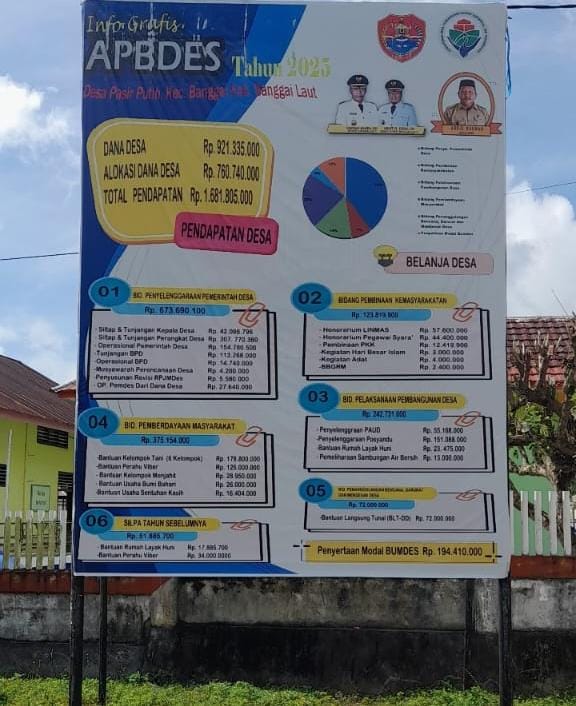 Banggaikece.id – Pemerintah Desa (Pemdes) Pasir Putih, Kecamatan Banggai, Kabupaten Banggai Laut, belum lama ini memasang baliho transparansi terkait penerimaan dan penggunaan Dana Desa (DD) serta Alokasi Dana Desa (ADD) tahun anggaran 2025.