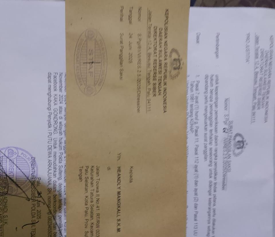 Banggaikece.id- Jurnalis Hendly Mangkali kembali diperiksa Direktorat Reserse Siber (Ditseber) Polda Sulteng, sebagai saksi, dalam kasus dugaan pelanggaran Undang-Undang ITE yang dilaporkan Istri Bupati Morowali Utara (Morut).