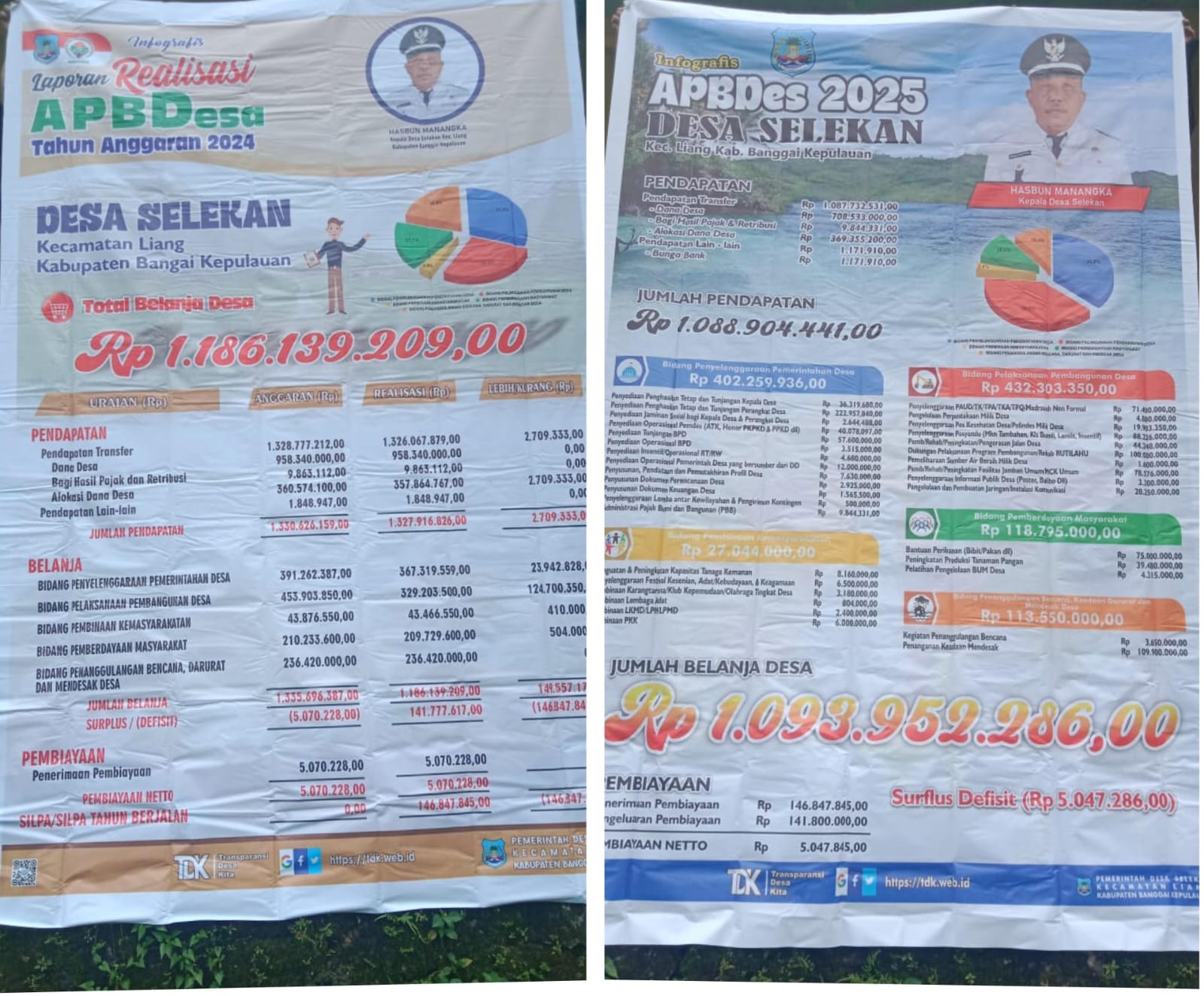 Banggaikece.id – Pemerintah Desa (Pemdes) Selekan, Kecamatan Liang, Kabupaten Banggai Kepulauan (Bangkep), menunjukkan komitmennya terhadap keterbukaan informasi publik dengan memasang baliho yang memuat rincian realisasi Anggaran Pendapatan dan Belanja Desa (APBDes) tahun 2024 serta alokasi anggaran APBDes tahun 2025.