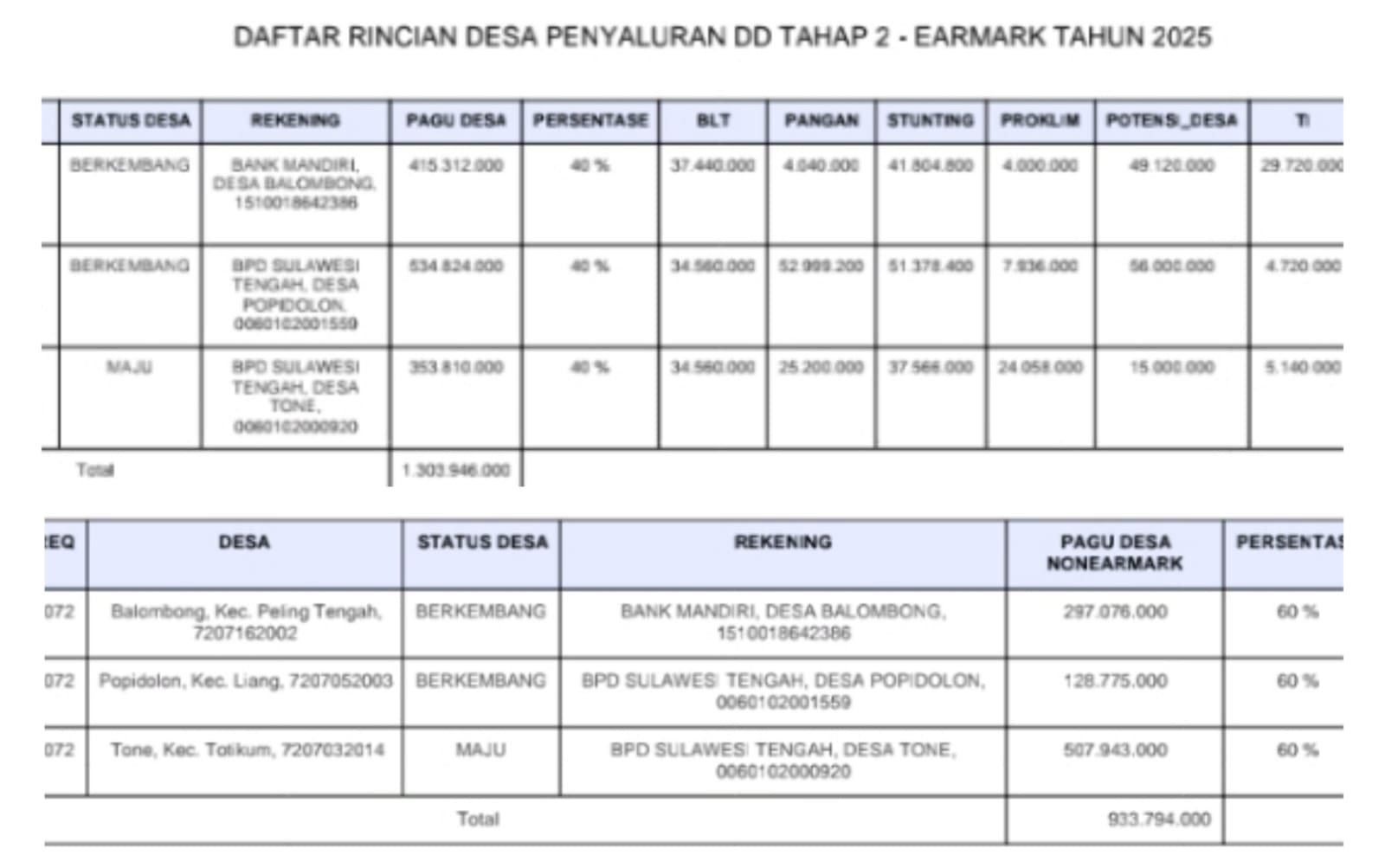 Banggaikece.id – Dari total 141 desa di Kabupaten Banggai Kepulauan (Bangkep), Sulawesi Tengah, baru 6 desa di 6 kecamatan yang telah menerima penyaluran Dana Desa tahap II untuk periode Juli–Desember 2025, dengan total nilai sebesar Rp4.608.714.200.