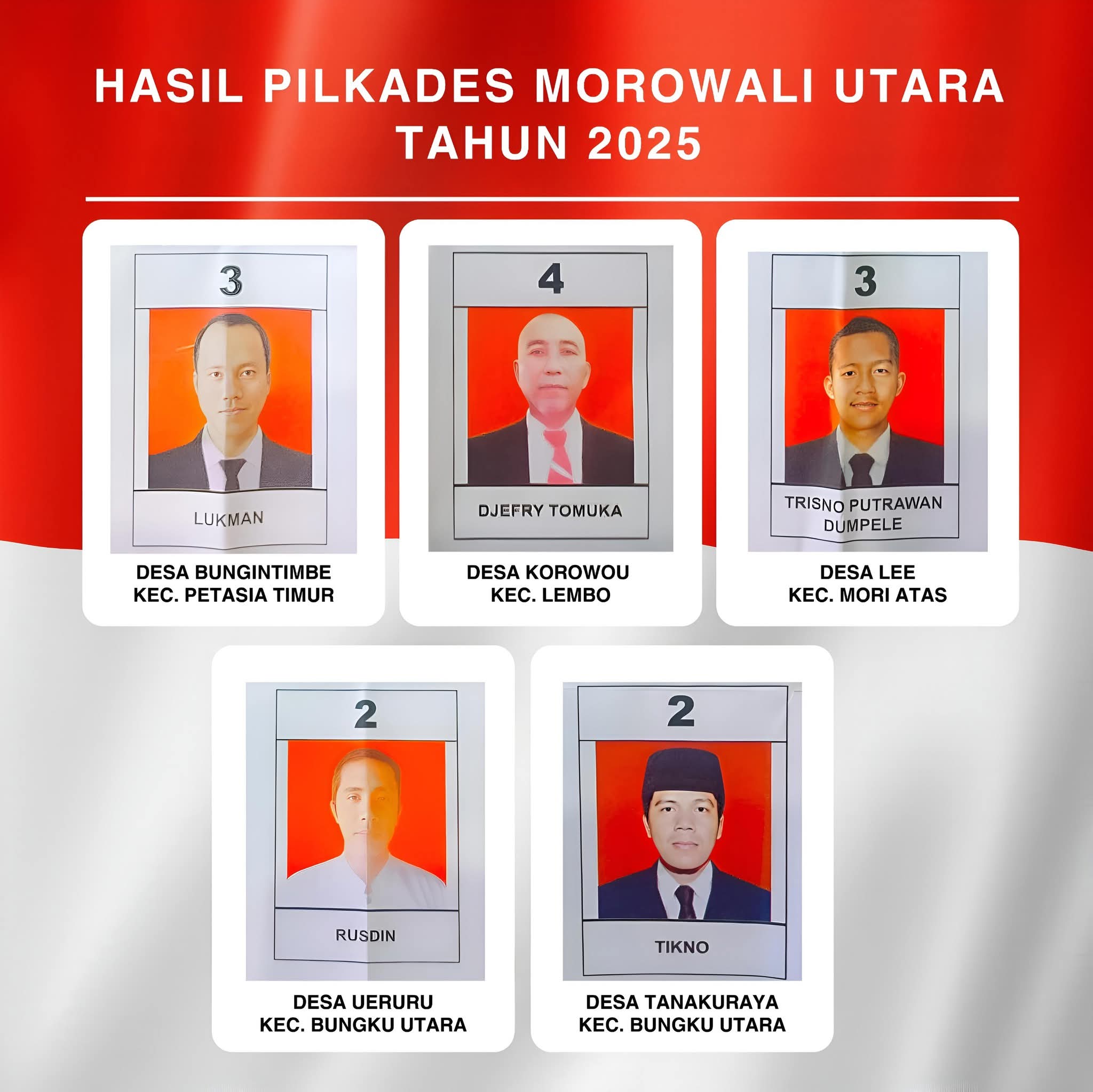 Pilkades Bungintimbe dimenangkan Lukman (487 suara), Korowou oleh Djefri Tomuka (437 suara), Lee unggul Trisno Putrawan Dumpele (195 suara), Ueruru dimenangkan Rusdin (131 suara) dan Tanakuraya dimenangkan Tikno (455 suara).