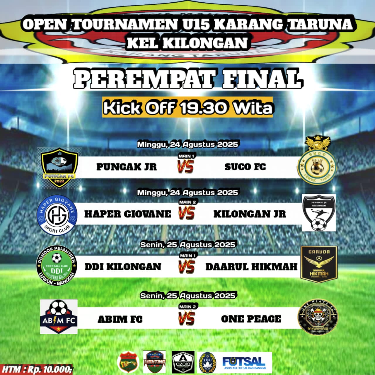 Banggaikece.id – Open Turnamen Futsal U-15 yang digelar Karang Taruna Kelurahan Kilongan, Kecamatan Luwuk Utara, resmi memasuki babak perempatfinal setelah menyelesaikan seluruh pertandingan penyisihan grup putaran kedua.