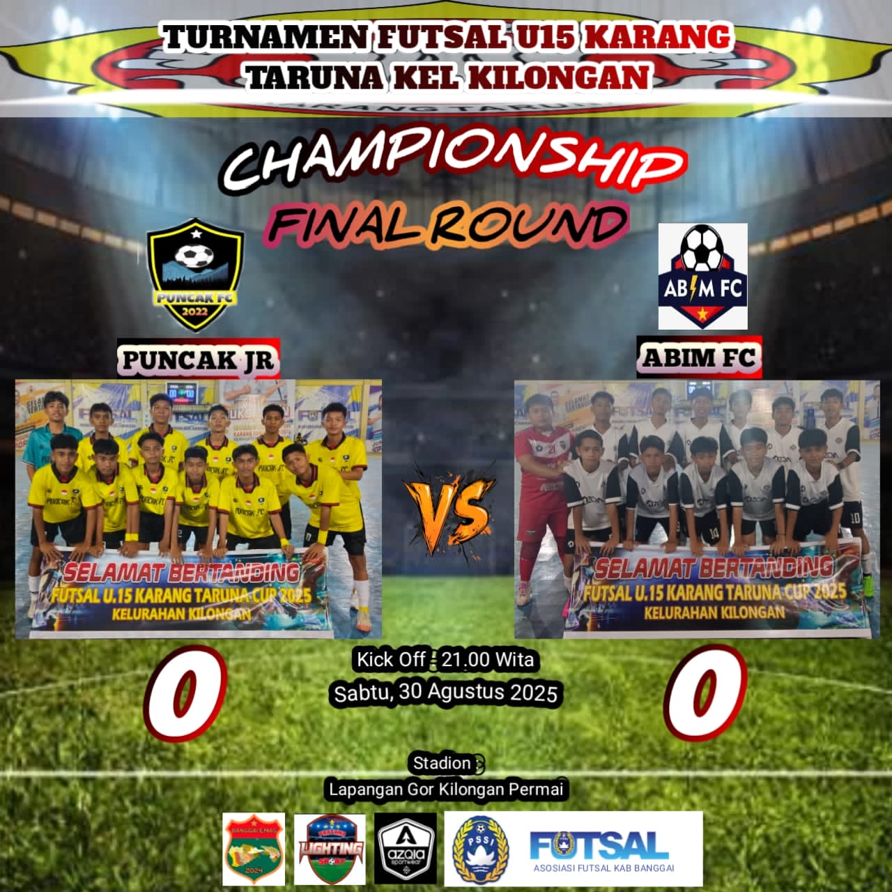 Banggaikece.id – Open Turnamen Futsal U-15 Piala Karang Taruna Kelurahan Kilongan, Kecamatan Luwuk Utara, segera mencapai puncaknya. Partai final akan digelar Sabtu malam, 30 Agustus 2025, di lapangan futsal GOR Kilongan.