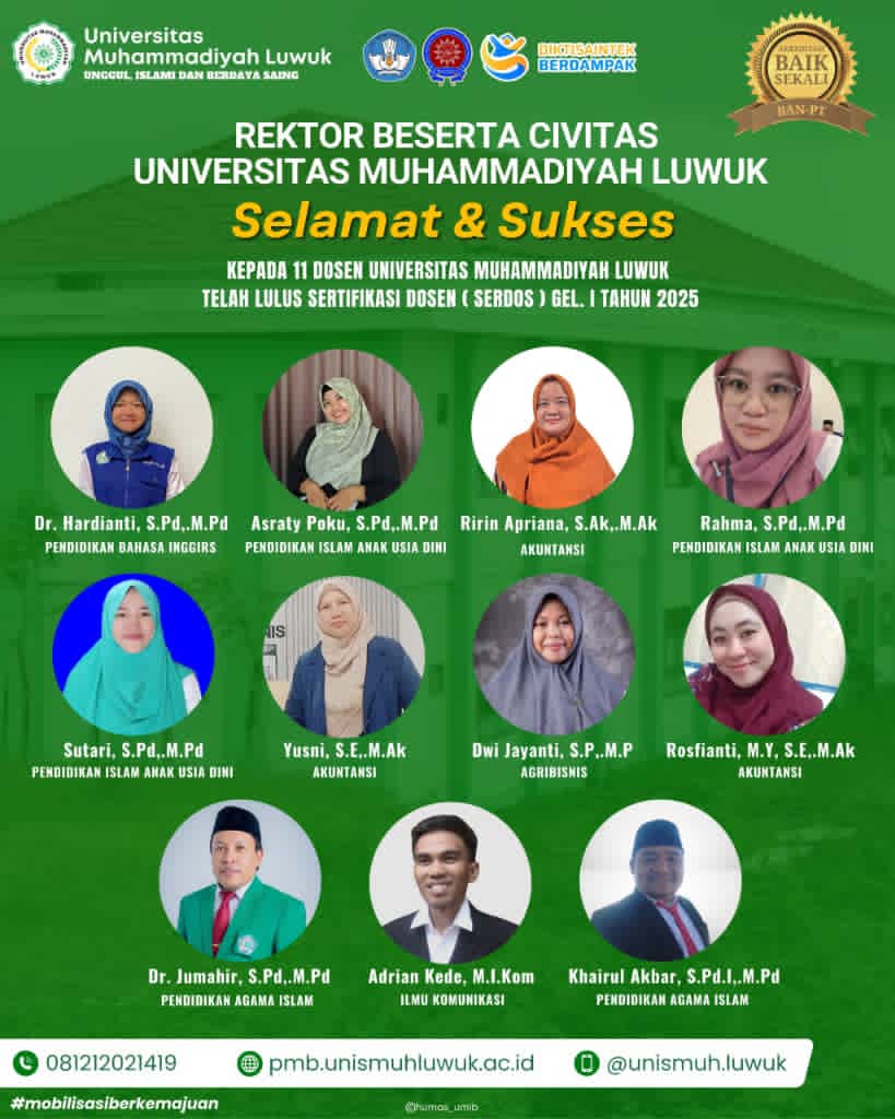 Banggaikece.id- Selamat, sebanyak 11 dosen Universitas Muhammadiyah (Unismuh) Luwuk lulus sertifikasi dosen (Serdos) Gelombang 1 Tahun 2025.