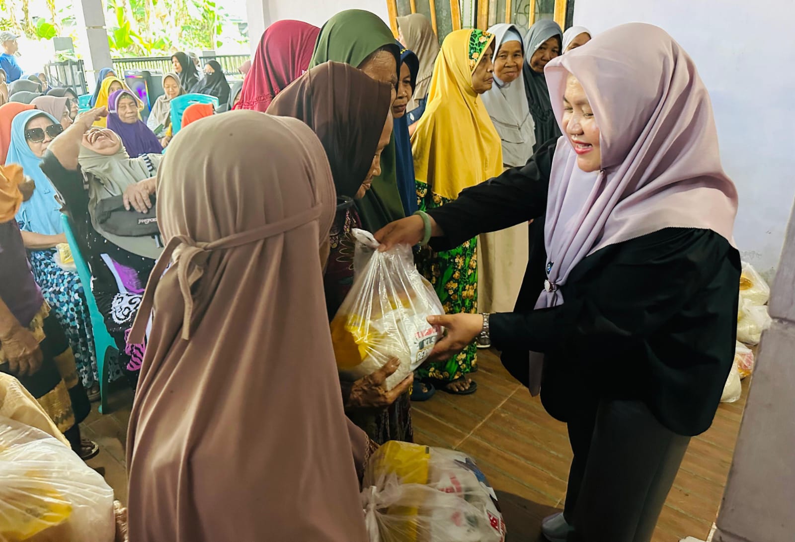 Setelah sambutan, dilanjutkan dengan penyerahan bantuan sembako yang diserahkan langsung oleh CEO PT KLS, Sulianti Murad. Masyarakat begitu antusias dan senang.