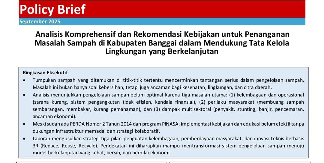 Melalui pendekatan tiga pilar – penguatan kelembagaan, pemberdayaan masyarakat, dan inovasi teknis – Banggai dapat mentransformasi krisis sampah menjadi peluang ekonomi sekaligus meningkatkan kesehatan dan kualitas lingkungan.