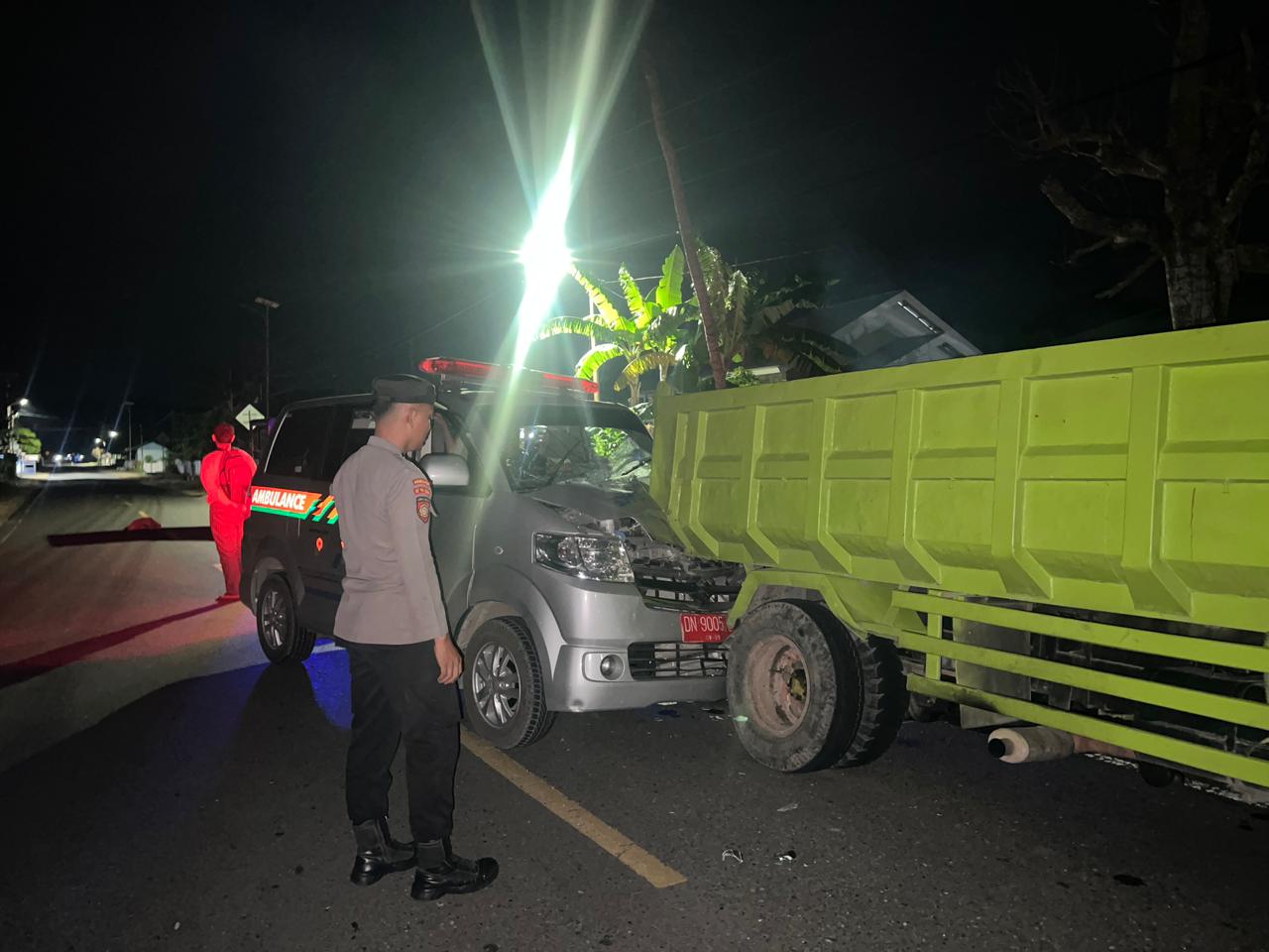 Sebuah ambulans Suzuki APV bernomor polisi DN 9004 C menabrak truk Hino Ditro DN 8651 CY yang tengah berhenti di pinggir jalan.