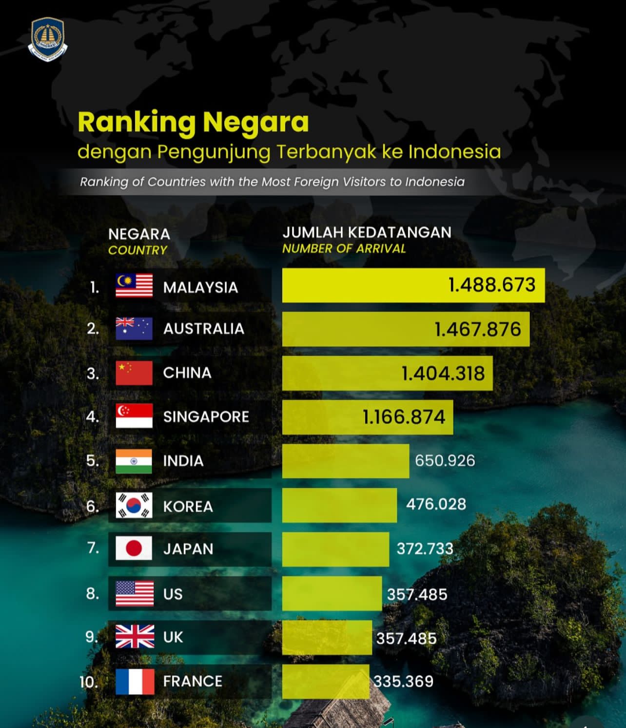 Banggaikece.id- 24 Oktober 2025 — Jumlah warga negara asing (WNA) yang masuk ke Indonesia mengalami peningkatan signifikan sepanjang periode 1 Januari hingga 17 Oktober 2025. Berdasarkan data Direktorat Jenderal Imigrasi, tiga negara asal pengunjung terbanyak adalah Malaysia, Australia, dan Tiongkok.