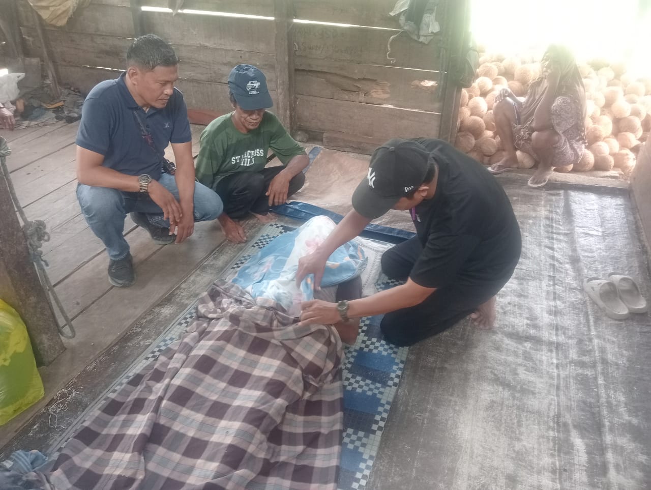 Bermula ketika saksi Aziz Lahay (62) yang sementara mengupas buah kelapa mendengar suara galon yang jatuh kelantai. Kemudian menghampiri dan menemukan korban sudah tergeletak dilantai dengan mulut mengeluarkan busa.