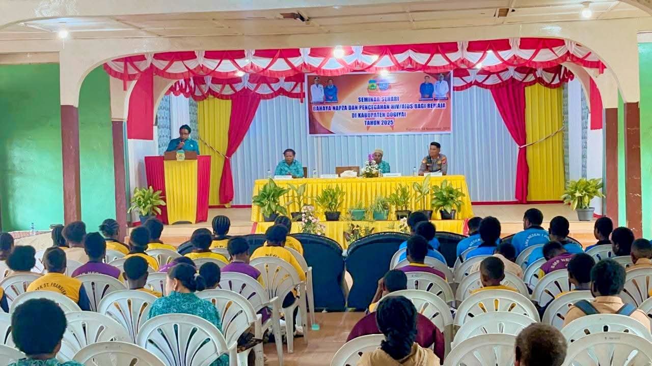 Dogiyai – Papua Tengah. Pada Jumat, 14 November 2025, telah dilaksanakan Seminar Sehari tentang bahaya Narkotika, Psikotropika dan Zat Adiktif (NAPZA) serta pencegahan HIV/AIDS bagi remaja. Kegiatan ini berlangsung di Aula Kotekamoge, Mowanemani, Kabupaten Dogiyai.