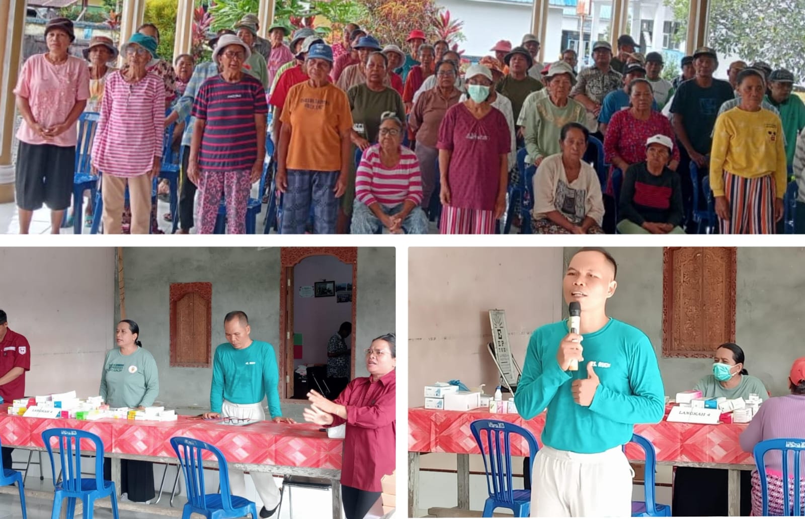 Acara diawali dengan alunan lagu penyemangat yang menciptakan suasana ceria dan penuh keakraban. Tim medis dari PKM Tangeban hadir memberikan pelayanan lengkap, mulai dari pemeriksaan kesehatan umum, konsultasi medis, hingga edukasi preventif mengenai pentingnya menjaga kesehatan di usia lanjut. Para lansia juga menerima tambahan asupan gizi sebagai wujud nyata perhatian pemerintah desa terhadap kesejahteraan mereka.