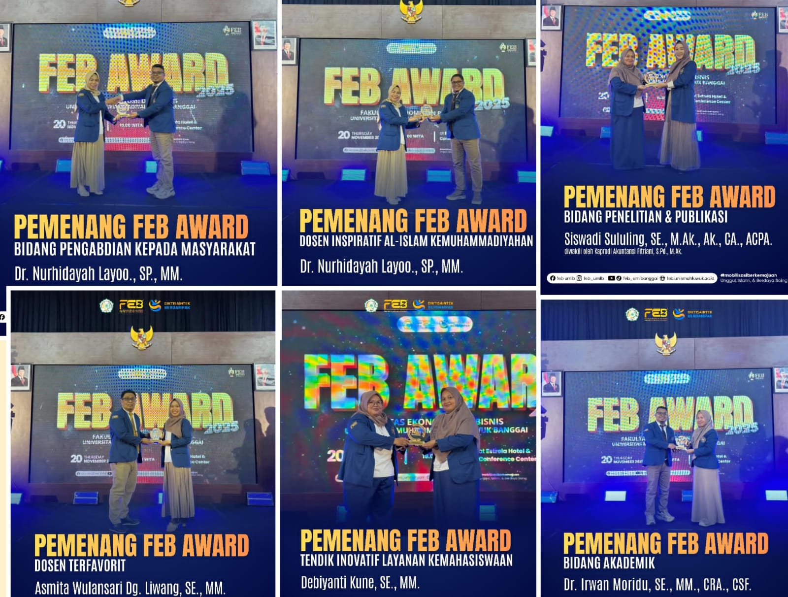 Salah satu momen yang mencuri perhatian adalah keberhasilan Dr. Nurhidayah Layoo, SP., MM. yang meraih dua penghargaan sekaligus, menjadikannya salah satu sosok paling bersinar pada FEB Award perdana ini.