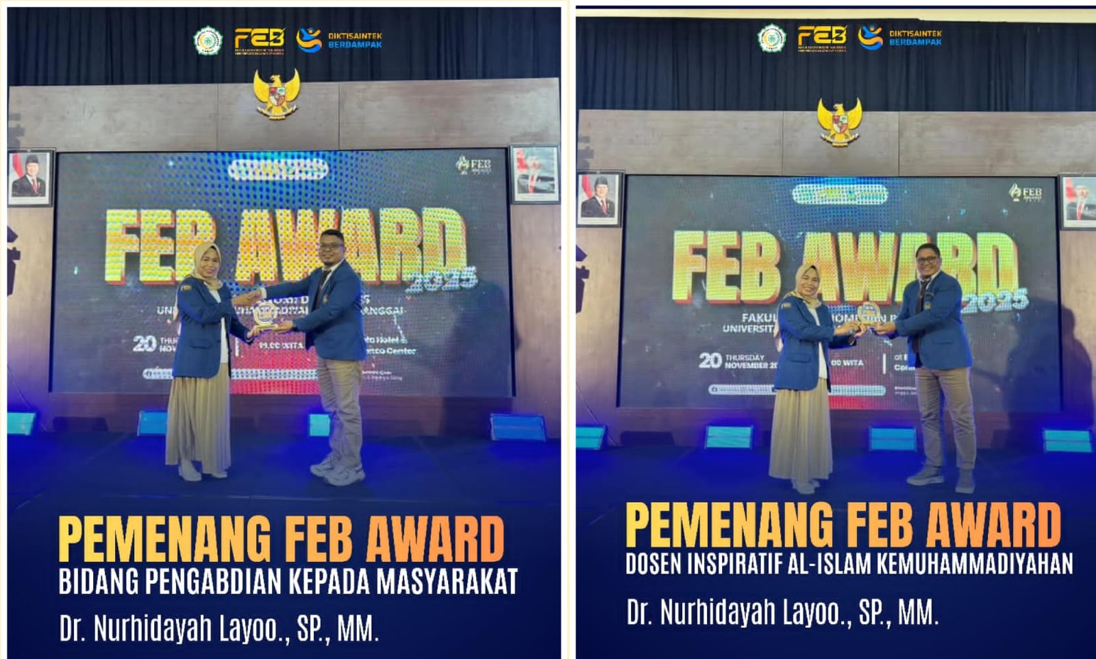 Salah satu momen yang mencuri perhatian adalah keberhasilan Dr. Nurhidayah Layoo, SP., MM. yang meraih dua penghargaan sekaligus, menjadikannya salah satu sosok paling bersinar pada FEB Award perdana ini.