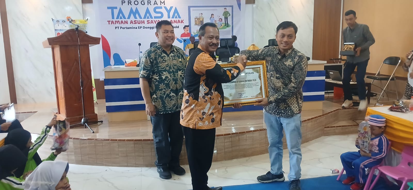 Penyerahan bingkisan kepada anak-anak TK/PAUD yang hadir ini dilakukan langsung oleh Manajer Pertamina EP DMF, Ridwan dan Asisten II Mujiono, serta Kadis Faisal Karim. (*)