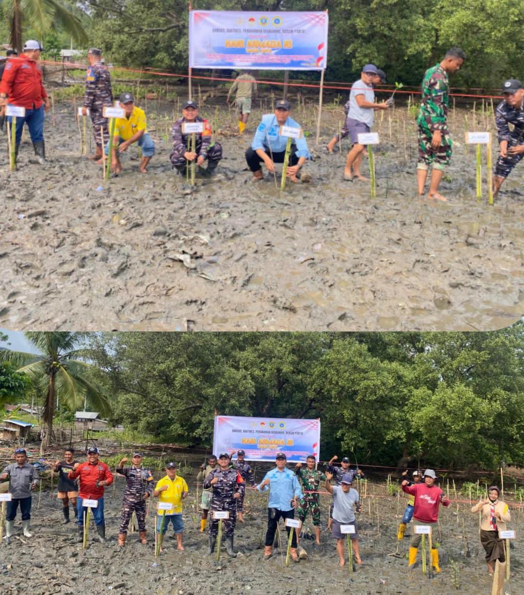 Pada sesi berikutnya, personel Posal Luwuk bersama pemerintah desa, Saka Bahari Posal Luwuk, unsur maritim pertambangan, serta masyarakat pesisir turut melakukan penanaman ratusan bibit mangrove jenis Rhizophora apiculata. Penanaman ini menjadi kontribusi nyata dalam upaya pelestarian lingkungan dan penguatan ekosistem pesisir. Rangkaian kegiatan ditutup dengan aksi bersih pantai guna menjaga kebersihan serta keindahan kawasan pesisir sekaligus mengedukasi masyarakat tentang pentingnya menjaga lingkungan laut.
