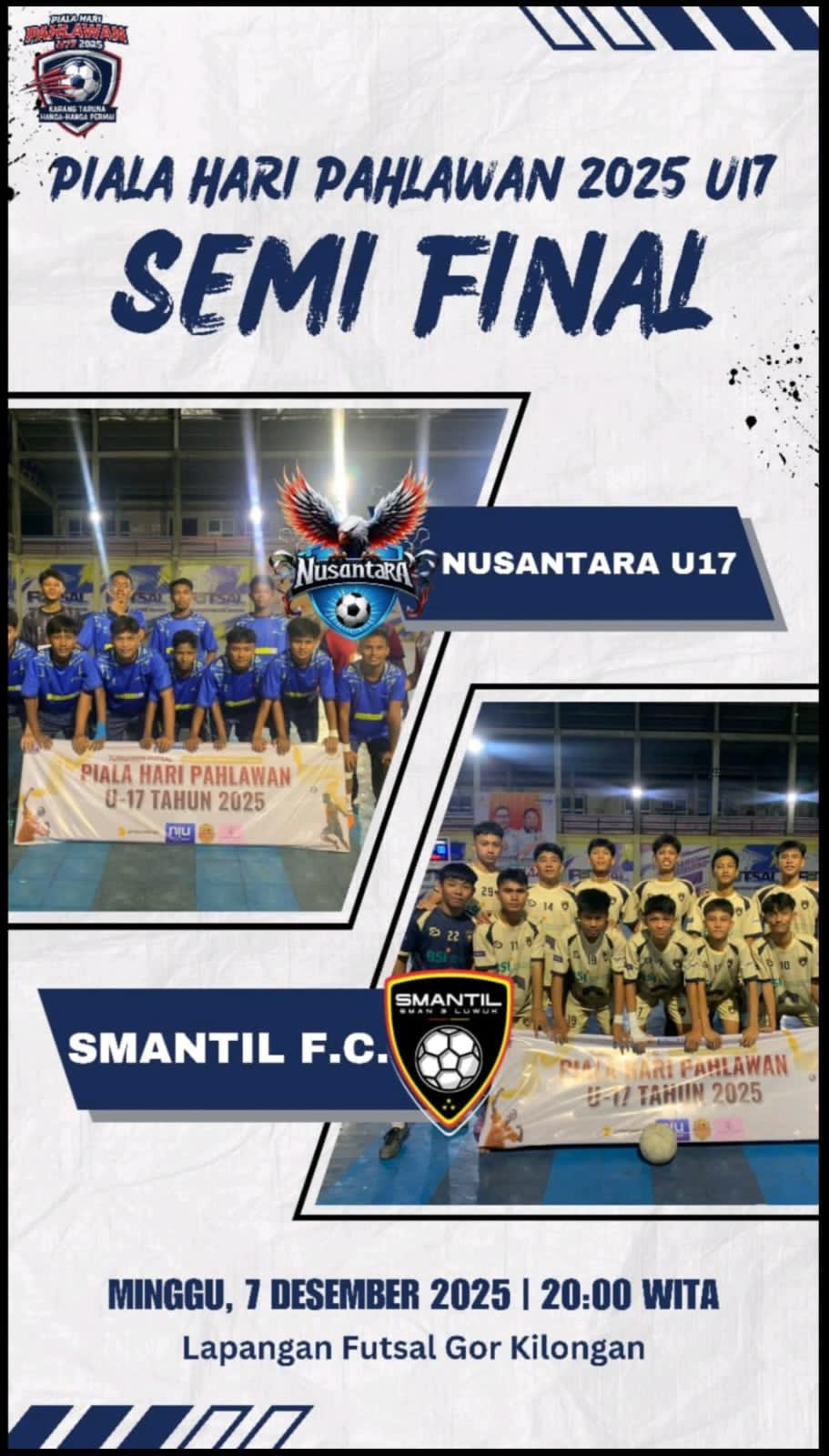 Untuk babak semifinal Piala Hari Pahlawan U-17 Tahun 2025 yang akan digelar Minggu (7/12), pertandingan pembuka akan mempertemukan Nusantara 17 melawan Smantil FC di Lapangan Futsal GOR Kilongan, Kecamatan Luwuk Utara. AGK