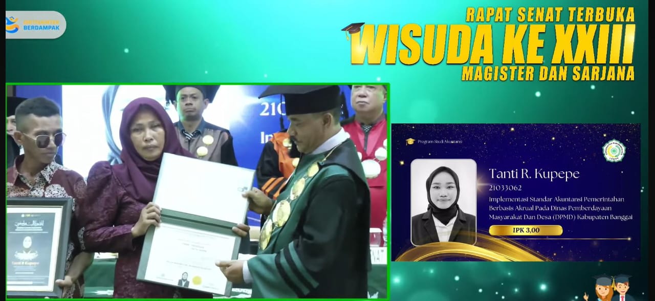 Bertempat di Hotel Estrella Luwuk, suasana wisuda yang semula berlangsung penuh keceriaan berubah menjadi haru saat orang tua mewakili almarhumah Tanti R. Kupepe, wisudawan Program Studi Akuntansi, untuk menerima ijazah.