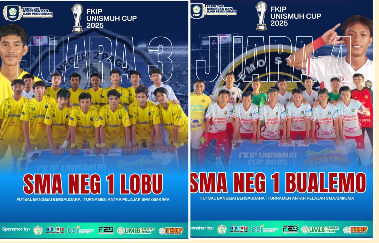 Dalam pertandingan bergengsi yang digelar untuk memeriahkan Milad ke-15 FKIP Unismuh Luwuk ini, SMAN 1 Lobu berhasil keluar sebagai juara 3 setelah sukses memenangkan laga melalui drama adu penalti dengan skor 4-3.