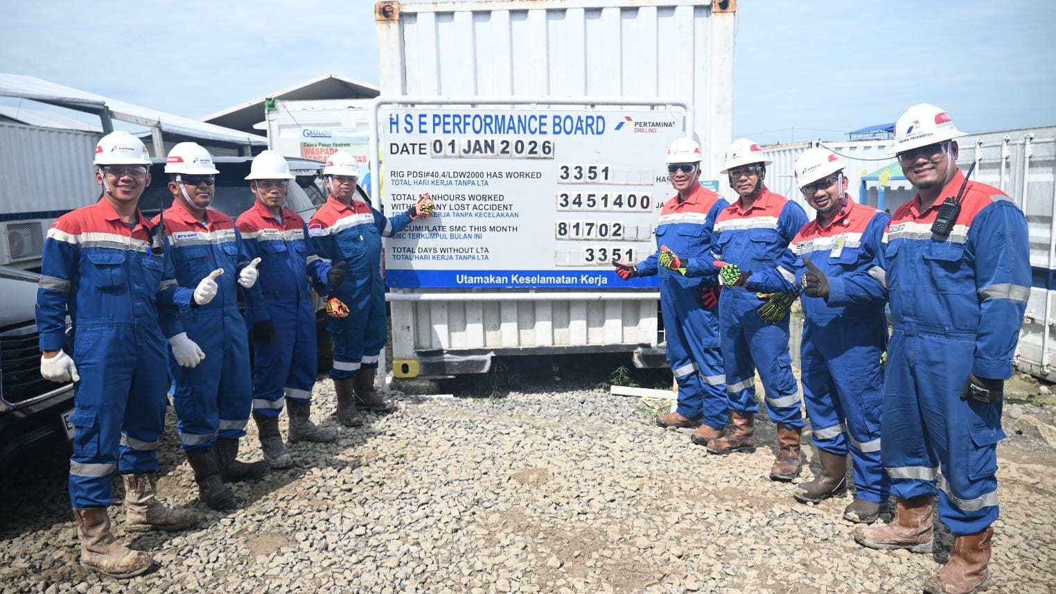 Capaian RIG PDSI#40.3/DS1500-E hingga 31 Desember 2025 pukul 00.00 WIB, total jam kerja selamat (safe man hours) telah mencapai 3.450.308 jam. Catatan ini mencerminkan konsistensi penerapan standar HSSE di RIG ini.