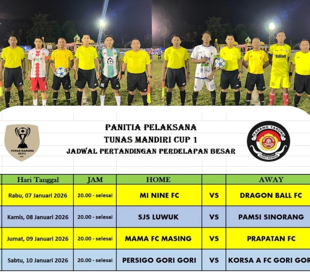 Babak 8 besar Open Turnamen Mini Soccer Tunas Mandiri Cup I dijadwalkan akan bergulir pada Rabu (7/1/2026). Salah satu laga yang akan tersaji mempertemukan Mi Nine A FC kontra Dragon Ball FC. AGK