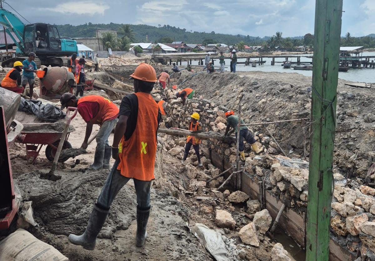 Rekonstruksi bangunan pengaman pasang surut Desa Tombos, Kecamatan Peling Tengah, oleh CV Banggai Cemerlang.