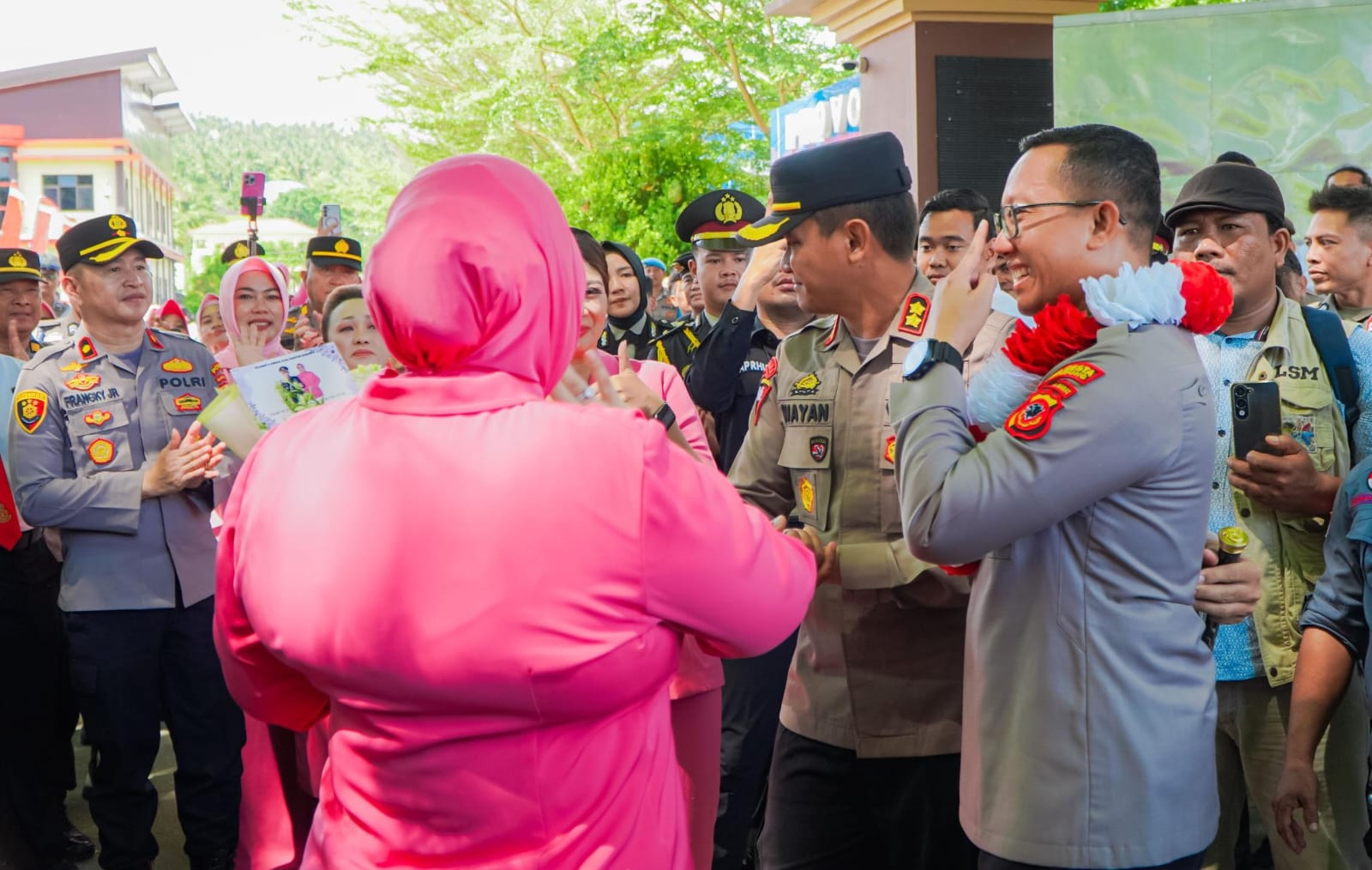 Penghormatan itu diiringi lantunan perpisahan, menambah nuansa haru. AKBP Putu dan istri tampak melangkah melewati gerbang kehormatan yang dipenuhi salam perpisahan dan pelukan tulus dari para anggota dan Bhayangkari.