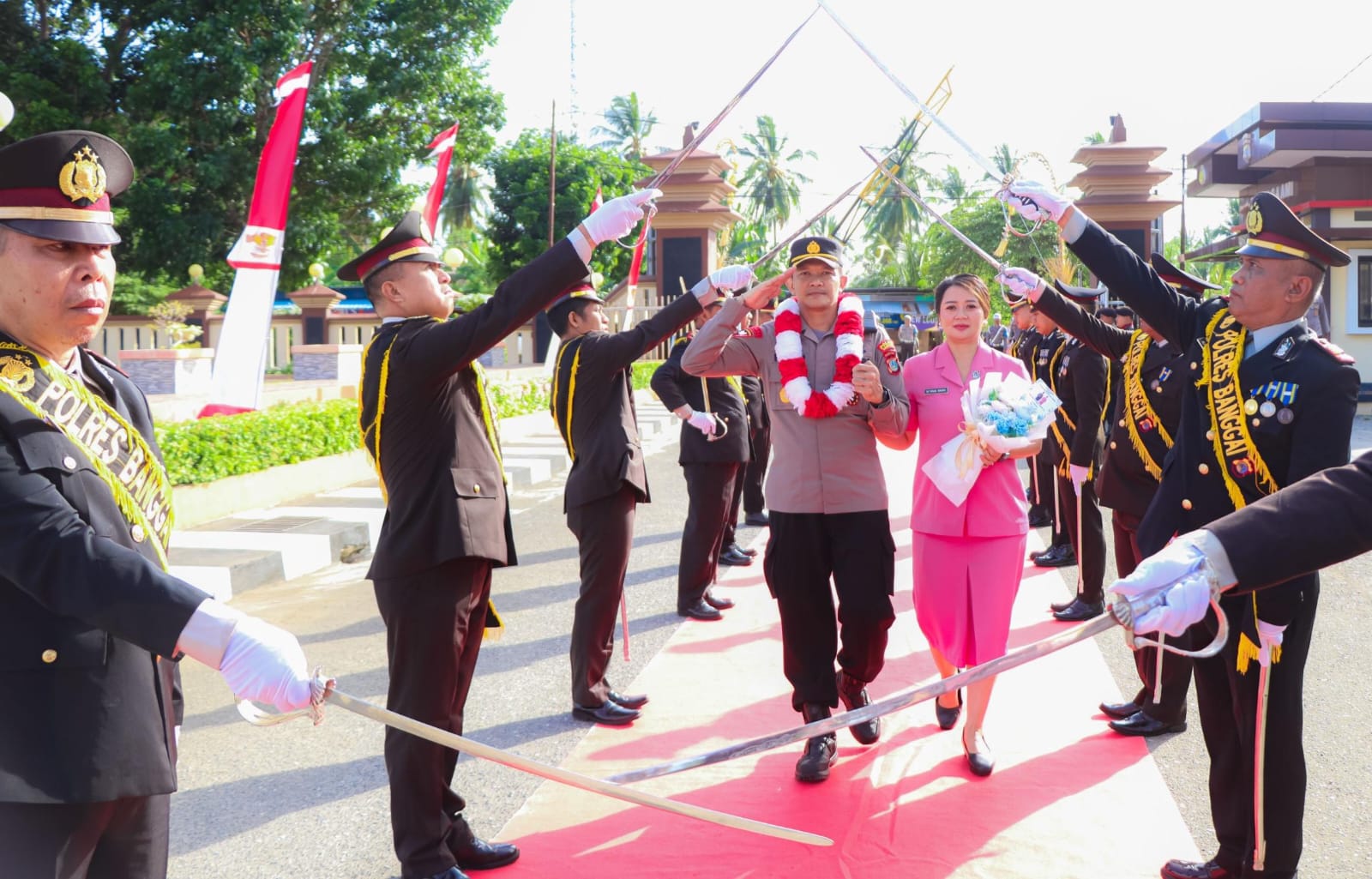 BANGGAI KECE- Polres Banggai menggelar tradisi penyambutan Kapolres Banggai yang baru, AKBP Wayan Wayracana Aryawan, SIK, bersama Ketua Bhayangkari Cabang Banggai Ny. Made Wayan di Mapolres Banggai, Sabtu (10/1/2026).