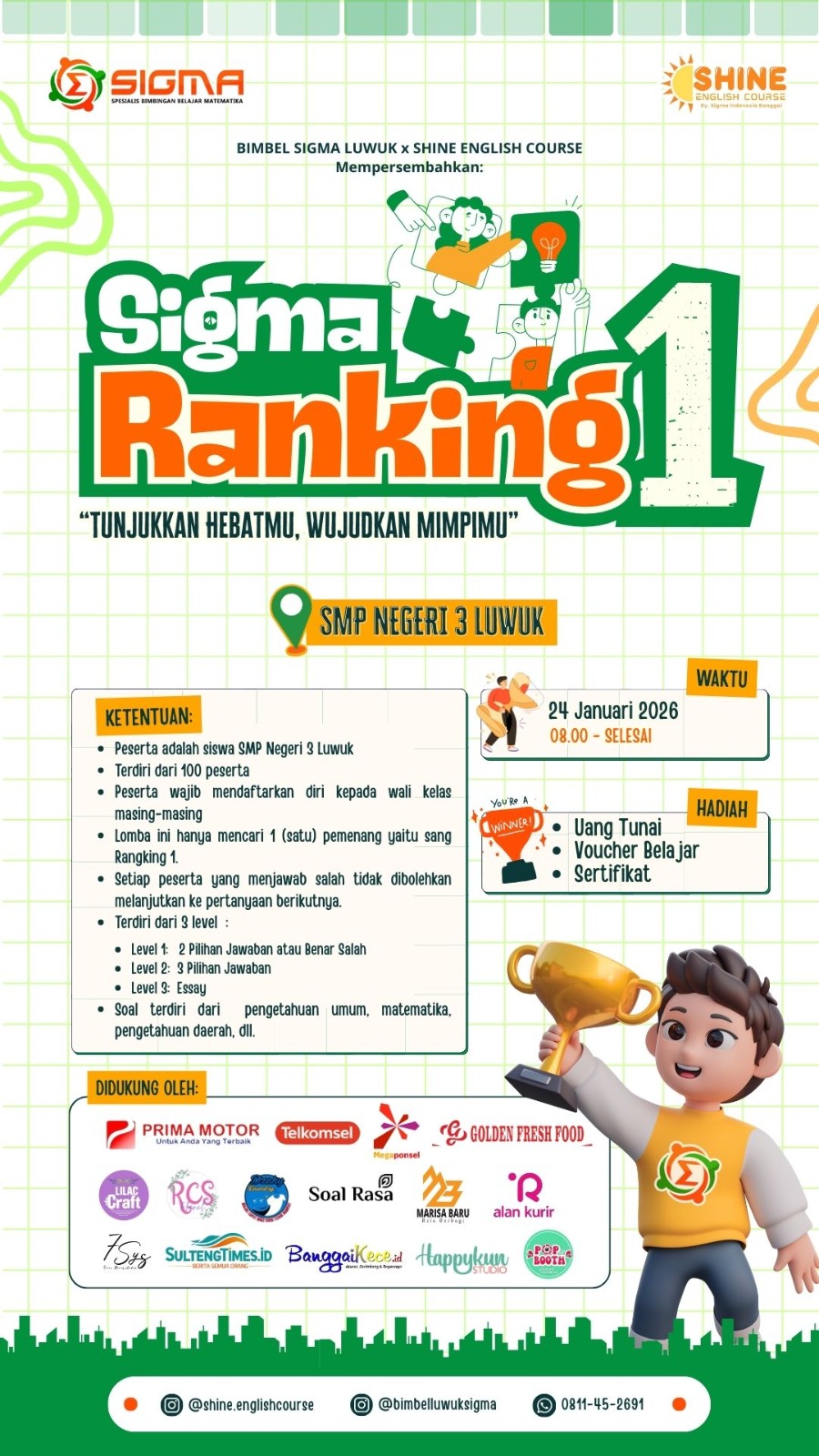 BANGGAI KECE- Bimbel Sigma Luwuk bekerja sama dengan Shine English Course akan menyelenggarakan kegiatan Sigma Ranking 1, sebuah ajang kompetisi edukatif yang bertujuan mengasah pengetahuan, konsentrasi, serta mental juara para siswa.