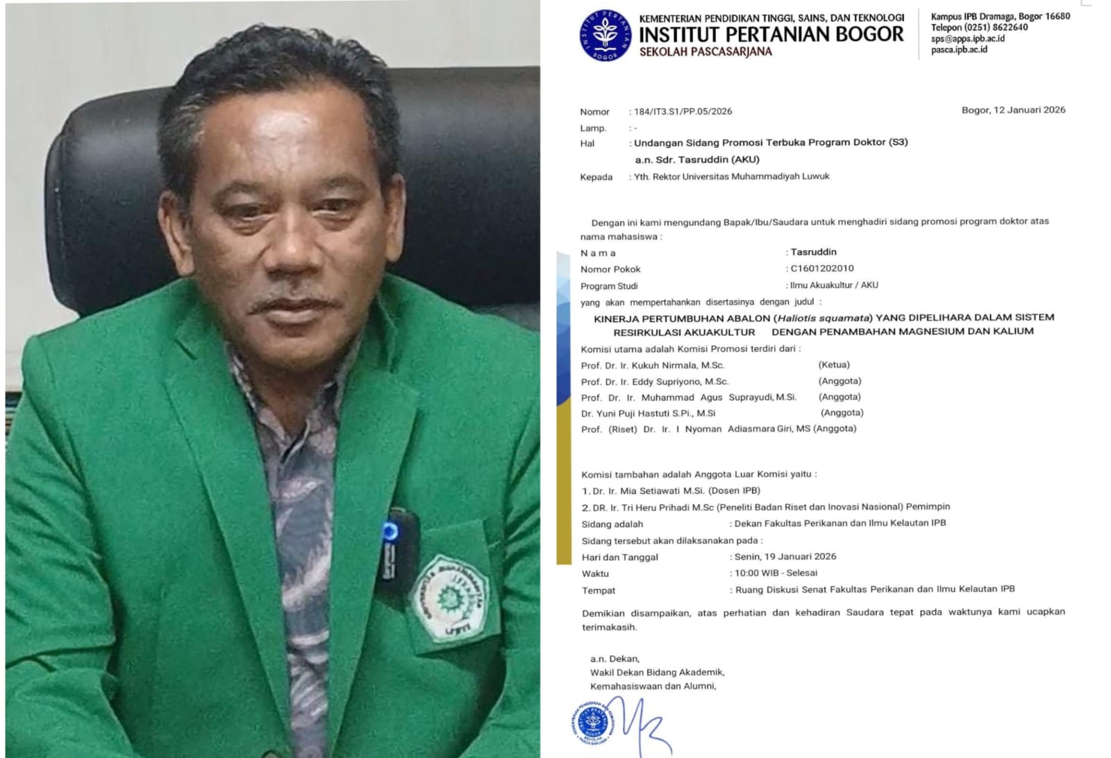 Di mana sidang promosi doktor tersebut akan dilaksanakan pada Senin 19 Januari 2026, mulai Pukul 10.00 sampai dengan selesai, bertemlat di Ruang Diskusi Senat Fakultas Perikanan dan Ilmu Kelautan IPB. (*)