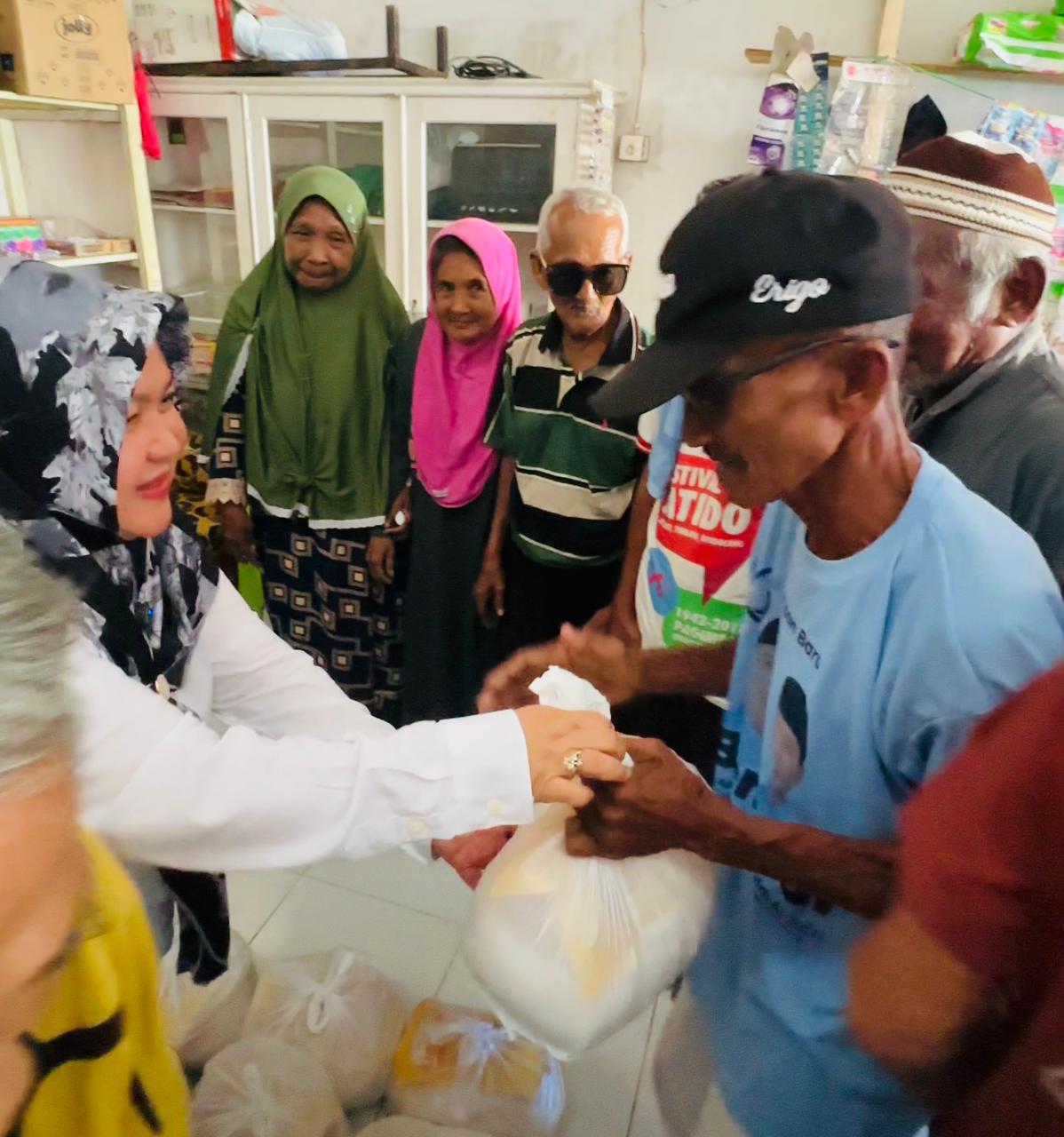 Kedatangan putri Almarhum H.Murad Husain itu disambut haru ratusan warga yang memadati lokasi pendistribusian bantuan.