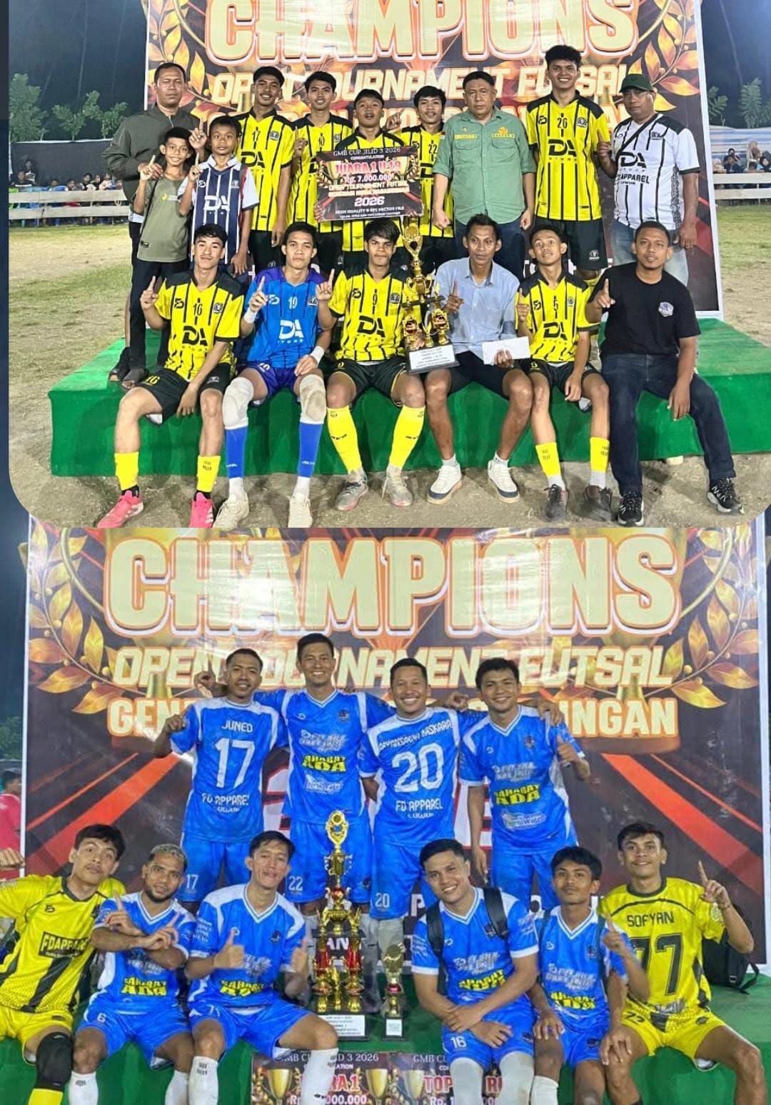 Sementara itu, di kategori umum, tim FD Apparel yang juga berada di bawah asuhan Coach Man berhasil meraih gelar juara usai mengalahkan Argani Zaky dengan skor 6–3. FD Apparel dipimpin kapten Anto Nesta, dengan komposisi pemain antara lain Dyba Muhammad, Juned, Abdul Azis, Pian, Arham, Ali Boti, Bayu Paku, dan rekan-rekan lainnya.