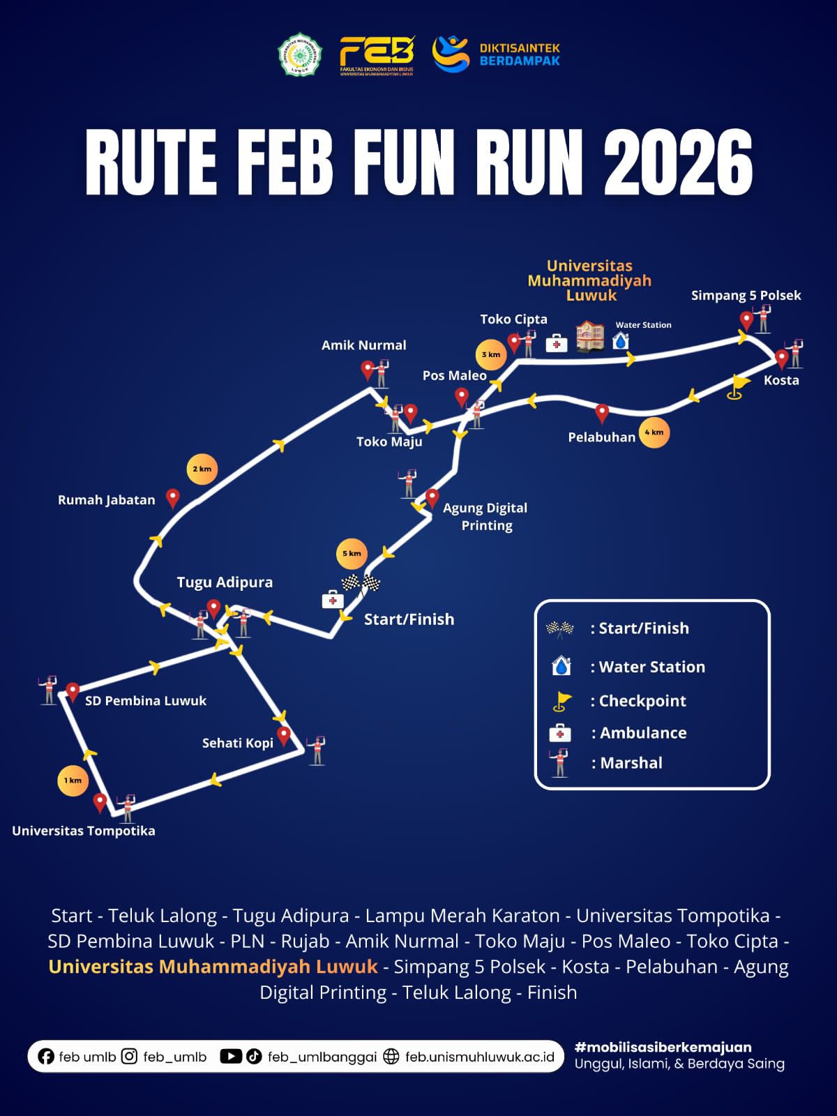 Diketahui, FEB FUN RUN ini juga sebagai ajang sosialisasi Universitas Muhammadiyah Unismuh (Unismuh) Luwuk, khususnya Fakultas Ekonomi dan Bisnis.