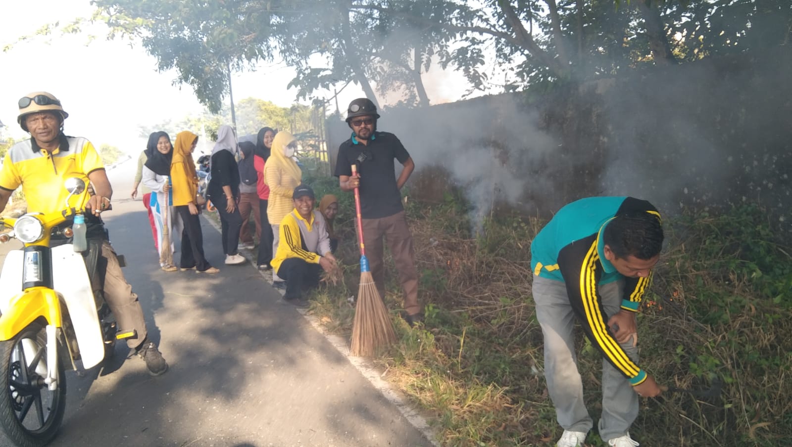 Kerja bakti difokuskan untuk membersihkan rumput liar dan sampah di sekitar Jalan Jalur 2 Desa Jaya Kencana.