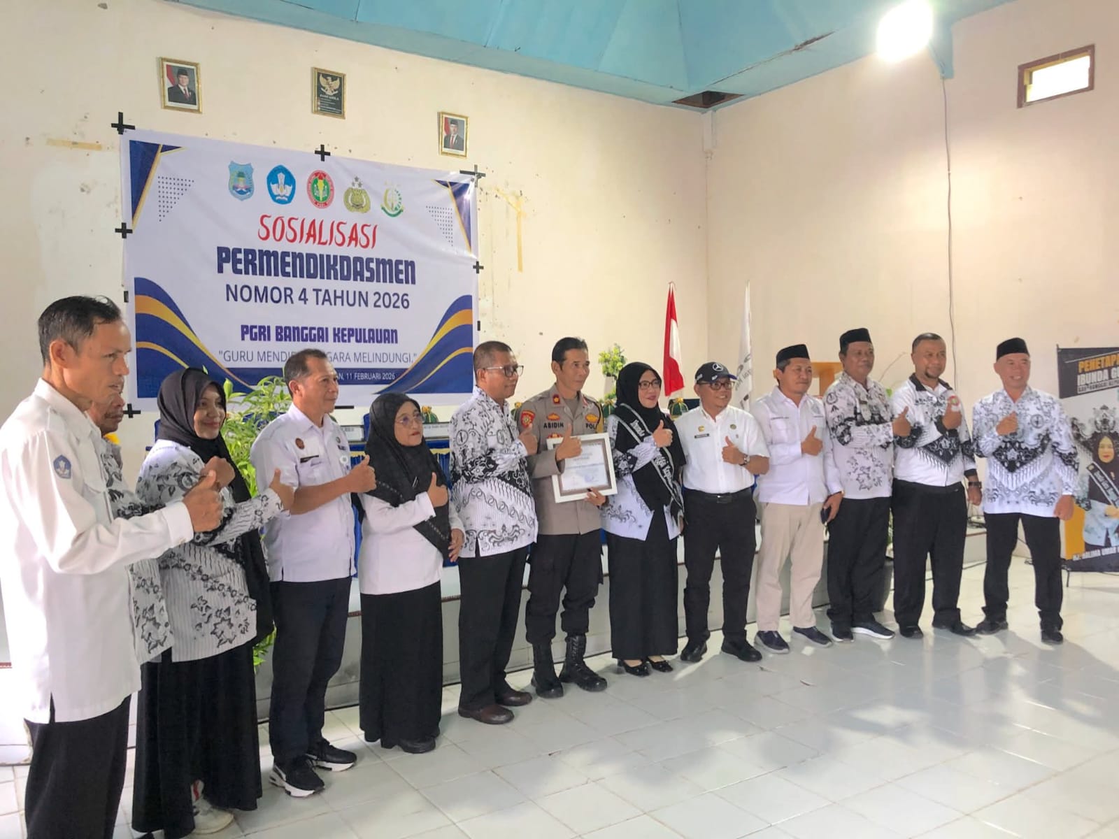Ia mengajak seluruh pemangku kepentingan mendukung implementasi regulasi tersebut. Kegiatan Sosialisasi Permendikdasmen Nomor 4 Tahun 2026 yang diinisiasi PGRI Kabupaten Banggai Kepulauan ini dihadiri Kepala Dinas Pendidikan dan Kebudayaan Kabupaten Banggai Kepulauan, Kepala Dinas DP3AP2KB Ramlin M. Hamid, S.Pd.SD., M.AP., Kapolres Banggai Kepulauan, serta Kepala Kejaksaan Negeri Banggai Laut yang mengikuti secara daring melalui Google Meet. Turut hadir Ketua Cabang PGRI se-Kabupaten Banggai Kepulauan, Pembina dan Pengurus PGRI Kabupaten Banggai Kepulauan, para pengawas sekolah, ketua komite jenjang TK, SD, SMP, MTs, SMA, dan SMK se-Kecamatan Tinangkung, para kepala sekolah, tokoh masyarakat, serta perwakilan guru se-Kabupaten Banggai Kepulauan.