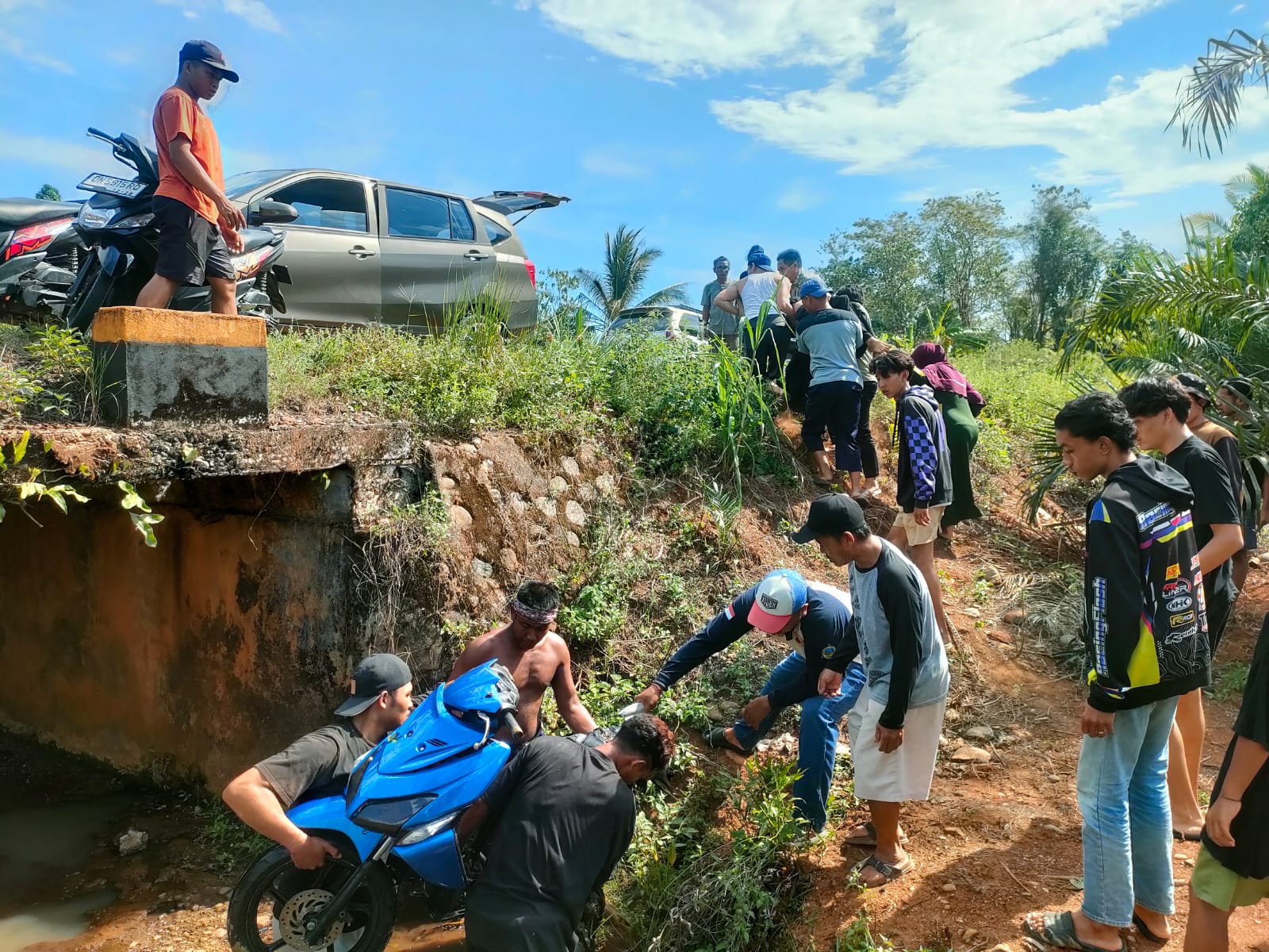 Selang 30 menit berlalu, saksi terkejut melihat postingan salah satu akun di media sosial Facebook, dimana korban tenggelam bersama sepeda motor yang dikendarainya.