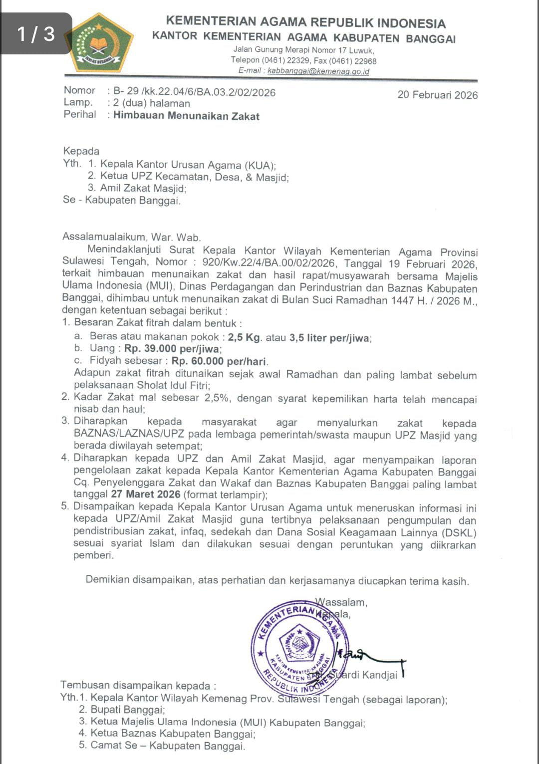 Surat bernomor B-29/kk.22.04/6/BA.03.2/02/2026 itu ditujukan kepada Kepala Kantor Urusan Agama (KUA), Ketua UPZ Kecamatan, Desa dan Masjid, serta Amil Zakat Masjid se-Kabupaten Banggai.